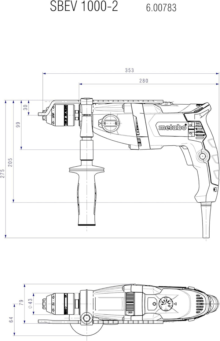 - Lieferumfang: 1 x Metabo Schlagbohrmaschine SBEV 1000-2 (600783500) / Inkl. Schnellspannbohrfutter Futuro Plus, gummierter Zusatzhandgriff, Bohrtiefenanschlag und metaBOX 145 L