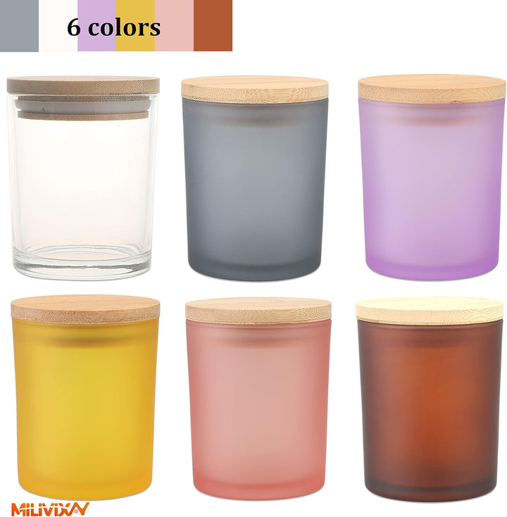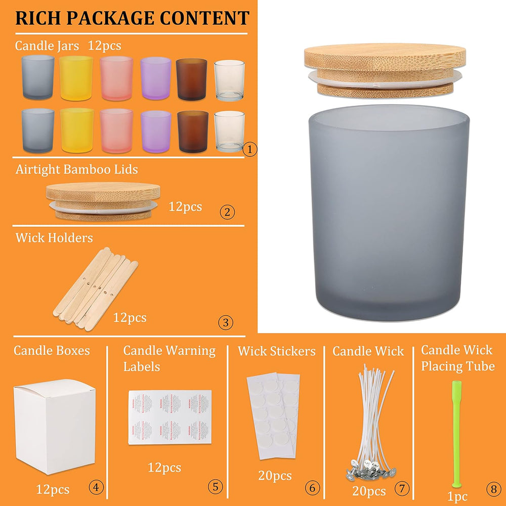- ▶️ Kaufen Sie es und Sie erhalten: 12 Gläser in 6 verschiedenen Farben mit luftdichten Bambusdeckeln, 20 Stück 15,2 cm Kerzendocht-Aufkleber, 20 Stück Dochthalter, 12 Stück Warnetiketten, 12 Stück Kerzenboxen, 1 Stück