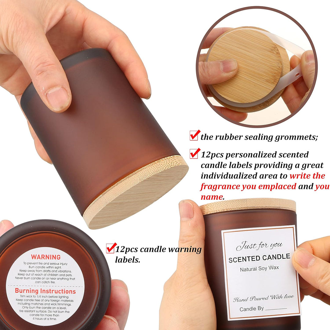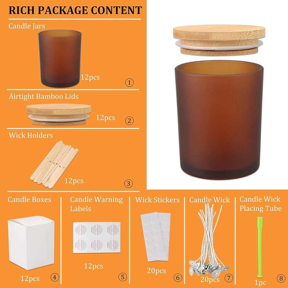 - ▶️ Kaufen Sie es und Sie erhalten: 12 Stück mattierte bernsteinfarbene Gläser mit luftdichtem Bambusdeckel, 20 Stück Kerzendochte, 20 Stück Kerzendocht-Aufkleber, 20 Stück Dochthalter, 12 Stück Kerzen-Warn-Etiketten, 12 Stück Kerzen-Boxen, 1