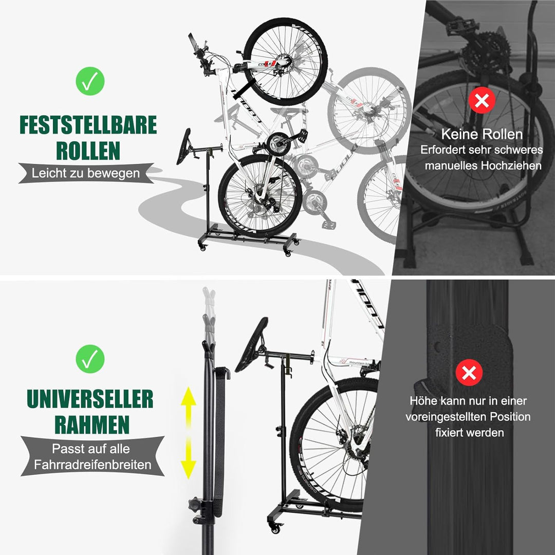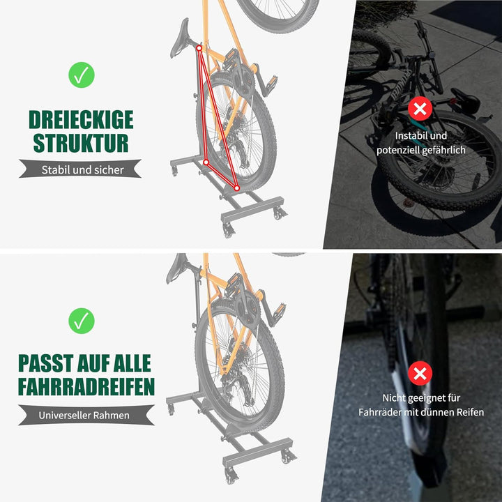 - Mobilität und Stabilität: Ausgestattet mit feststellbaren Rollrädern, ermöglicht der Mimoke Fahrradständer einfaches Verschieben und sichere Positionierung.