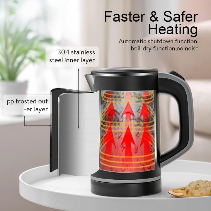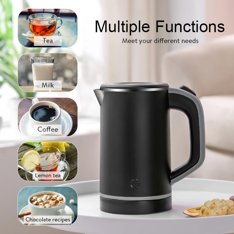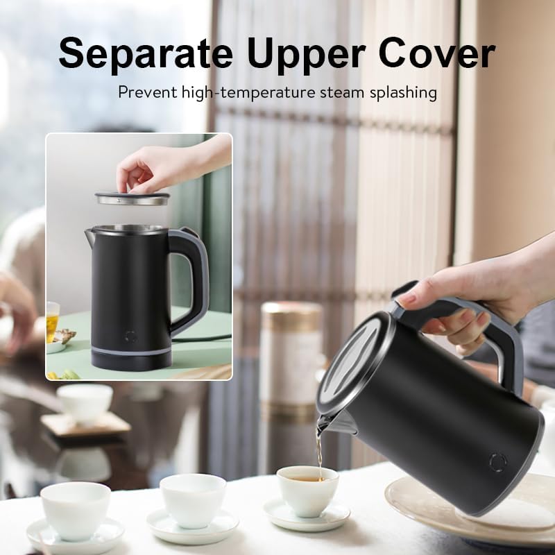 - Doppelwandiges Design: Der Wasserkocher wird mit Doppelwandtechnologie hergestellt, mit einer isolierten Soft-Touch-Oberfläche und einem Inneren aus lebensmittelechtem Edelstahl, das die Körperwärme reduziert und die Sicherheit und Haltbarkeit des