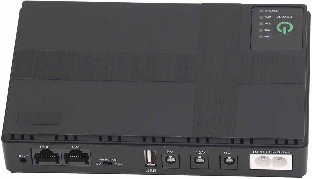 - [Breite Ausgabemethoden] Die USV bietet Ausgabeoptionen von DC 5 V, 9 V und 12 V bei 2 A sowie POE 15 V und 24 V bei 1 A und unterstützt jeden Strom unter 2 A.