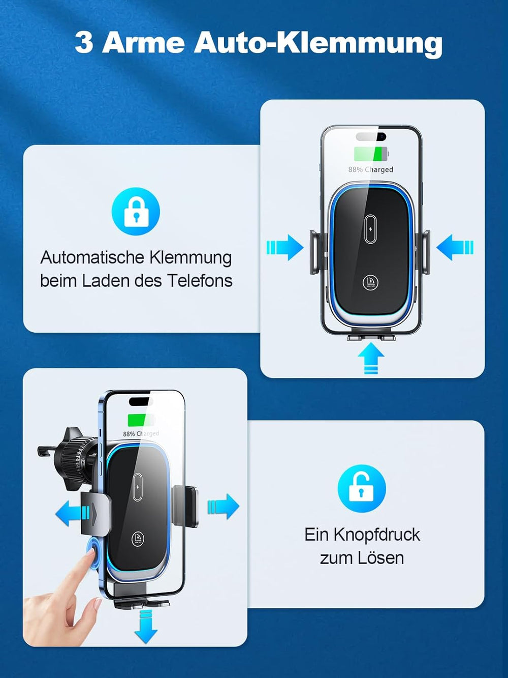 - [Einhandbedienung, Präzise Automatische Ausrichtung] Entdecken Sie den ultimativen Komfort unserer Kabelloses Ladegerät Auto mit fortschrittlicher elektromagnetischer Sensortechnologie. Die 3-Achs-Arme passen sich automatisch an Ihr Telefon (4,7-6,9