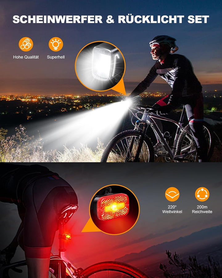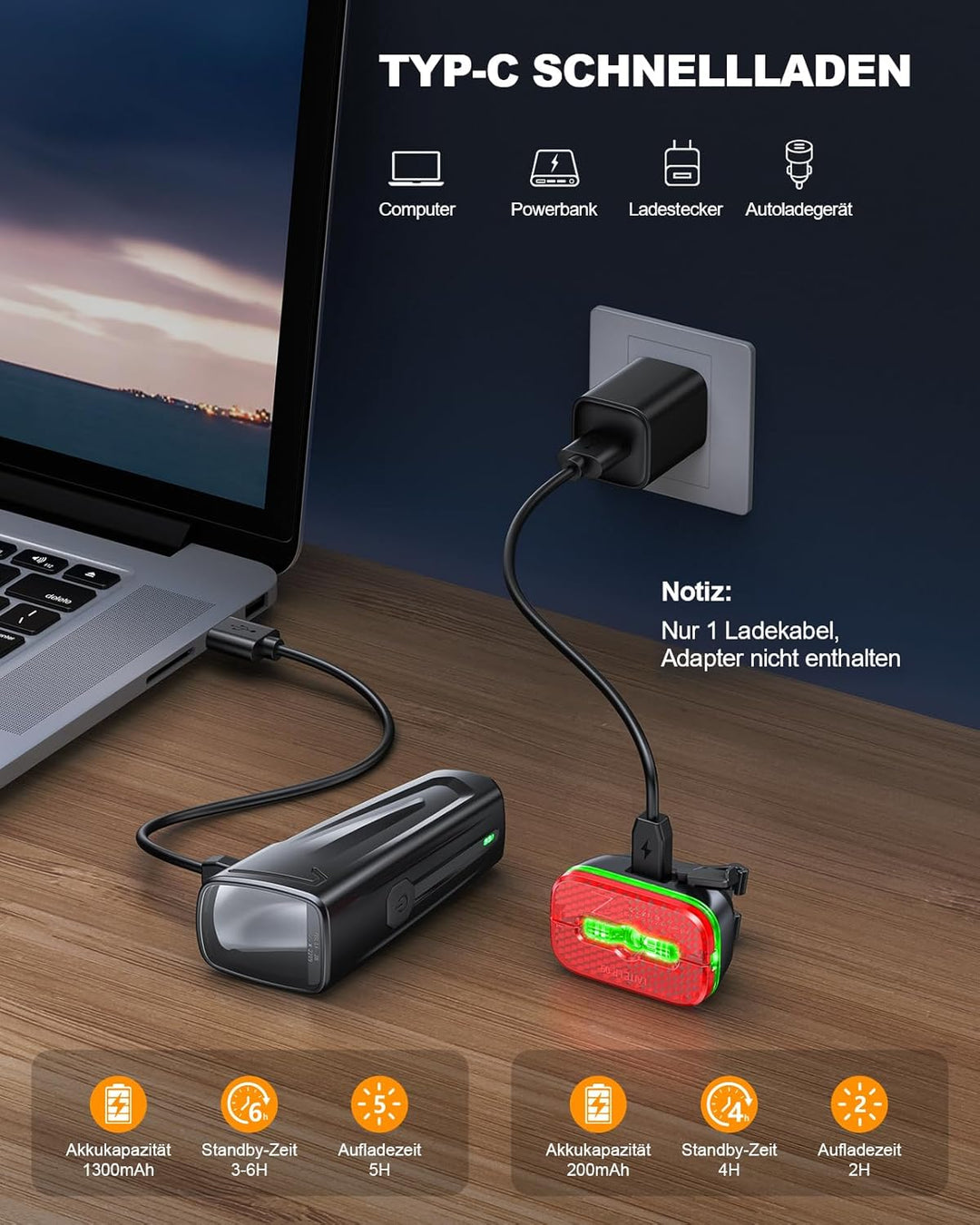 - USB-Laden & Lange Laufzeit: Unsere wieder aufladbaren Fahrradlampe sind mit einem 1300mAh-Akku für das LED Fahrradlicht Vorne und einem 200mAh-Akku für das Fahrrad Rücklicht ausgestattet. Im "Niedrig Licht" Modus bietet der Scheinwerfer eine