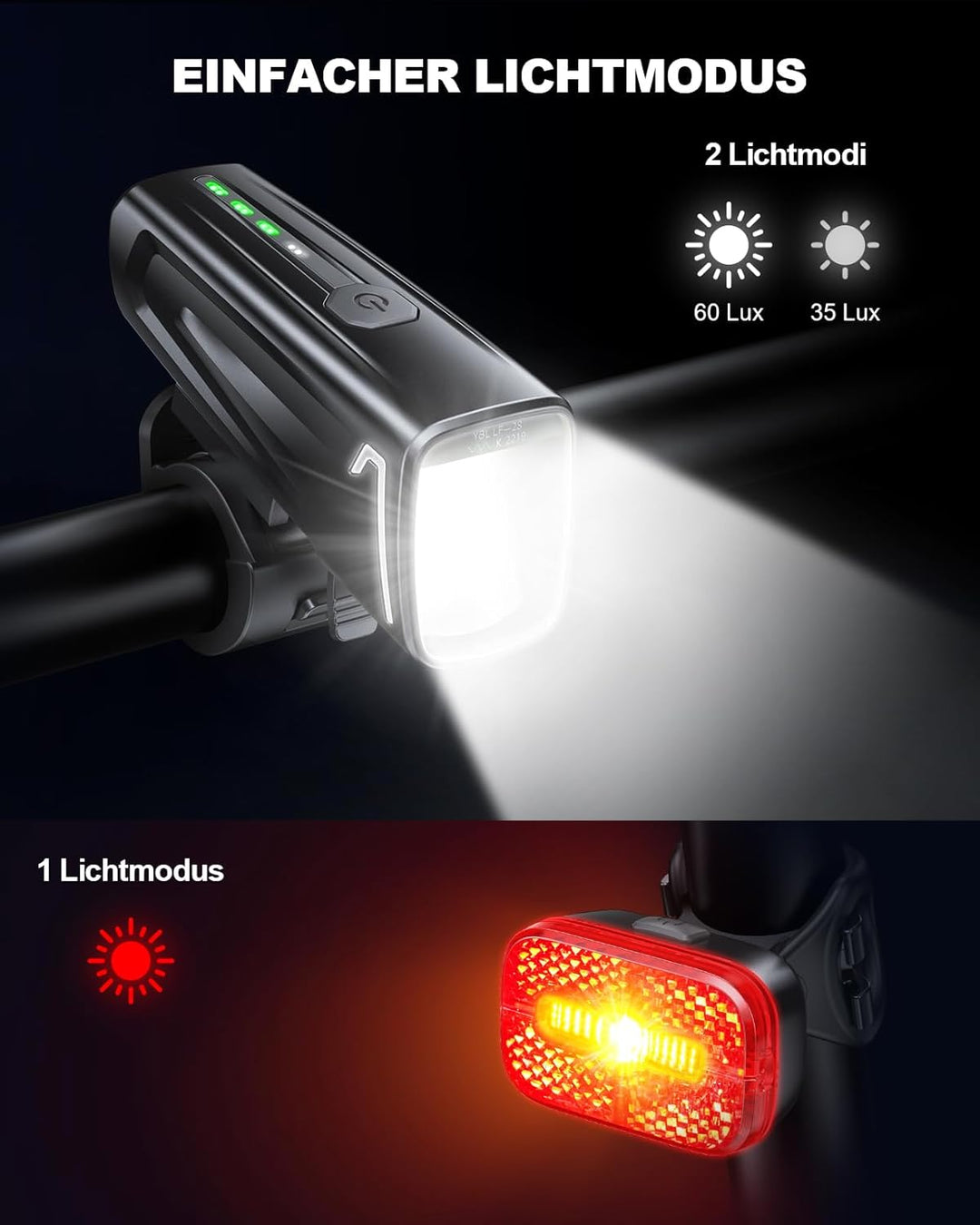 - Hochgradig Hell & Einfache Modi: Durch den Einsatz modernster Lampenperlen strahlen unsere Fahrrad Licht eine blendende Helligkeit von 60/35Lux aus. Das Fahrradlampe Vorne verfügt über 2 Modi (hoch und niedrig), das Rücklicht Fahrrad bietet einen