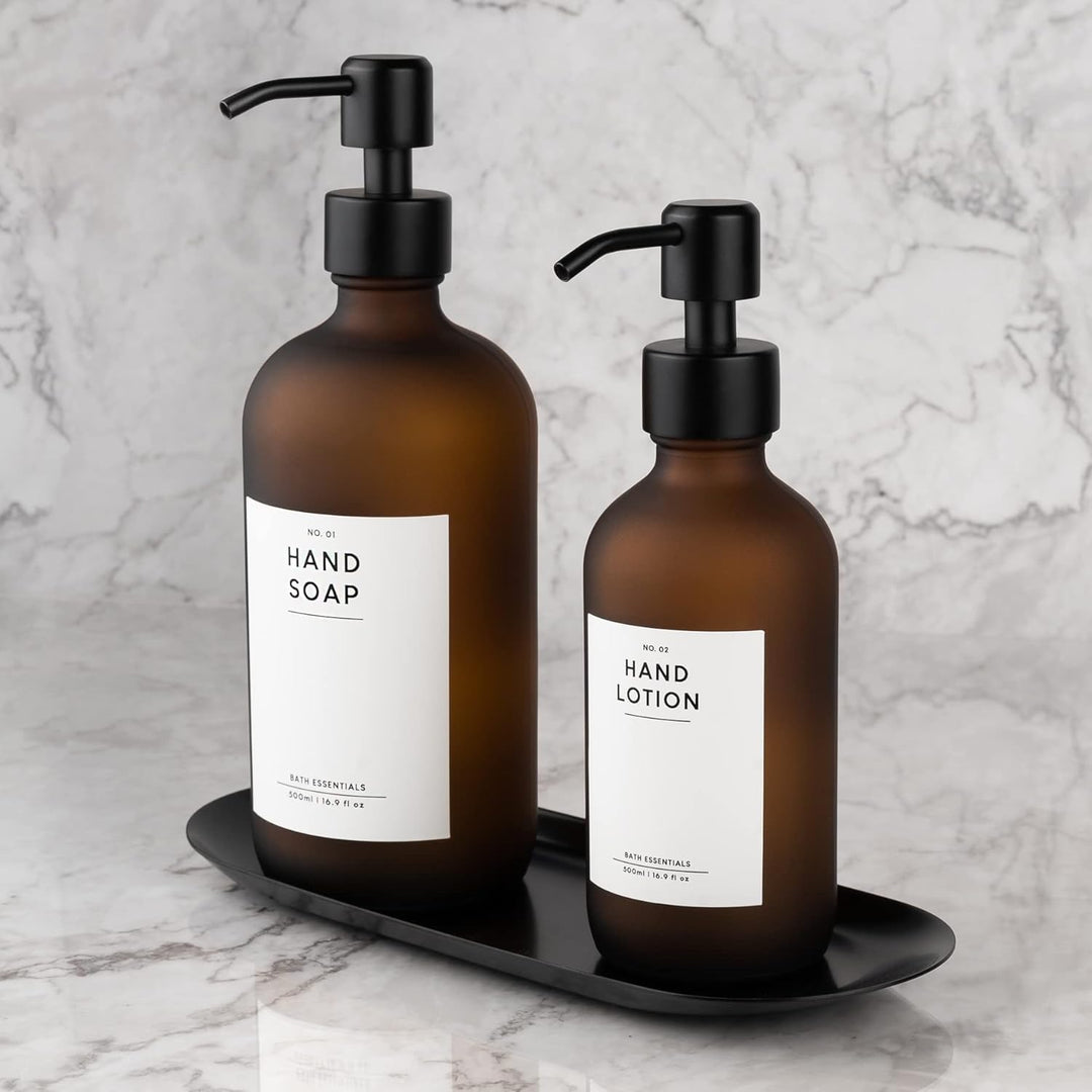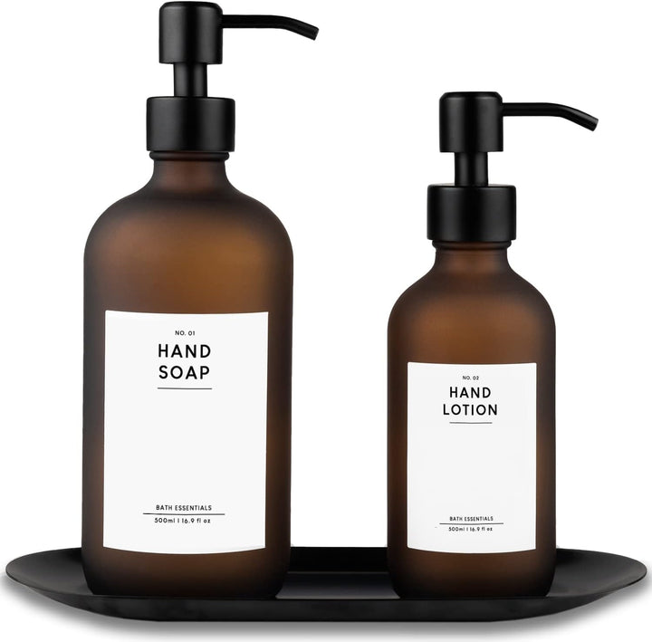 - ELEGANT & STILVOLL Lasse einen Hauch von Charme mit den design Spendern von Monoko in dein Bad oder Küche einziehen. Ein Set aus 2 Glasflaschen in einem matten Braun und Tablett kombiniert mit schwarzen Pumpköpfen aus Edelstahl. Mit Eleganz entworfen,