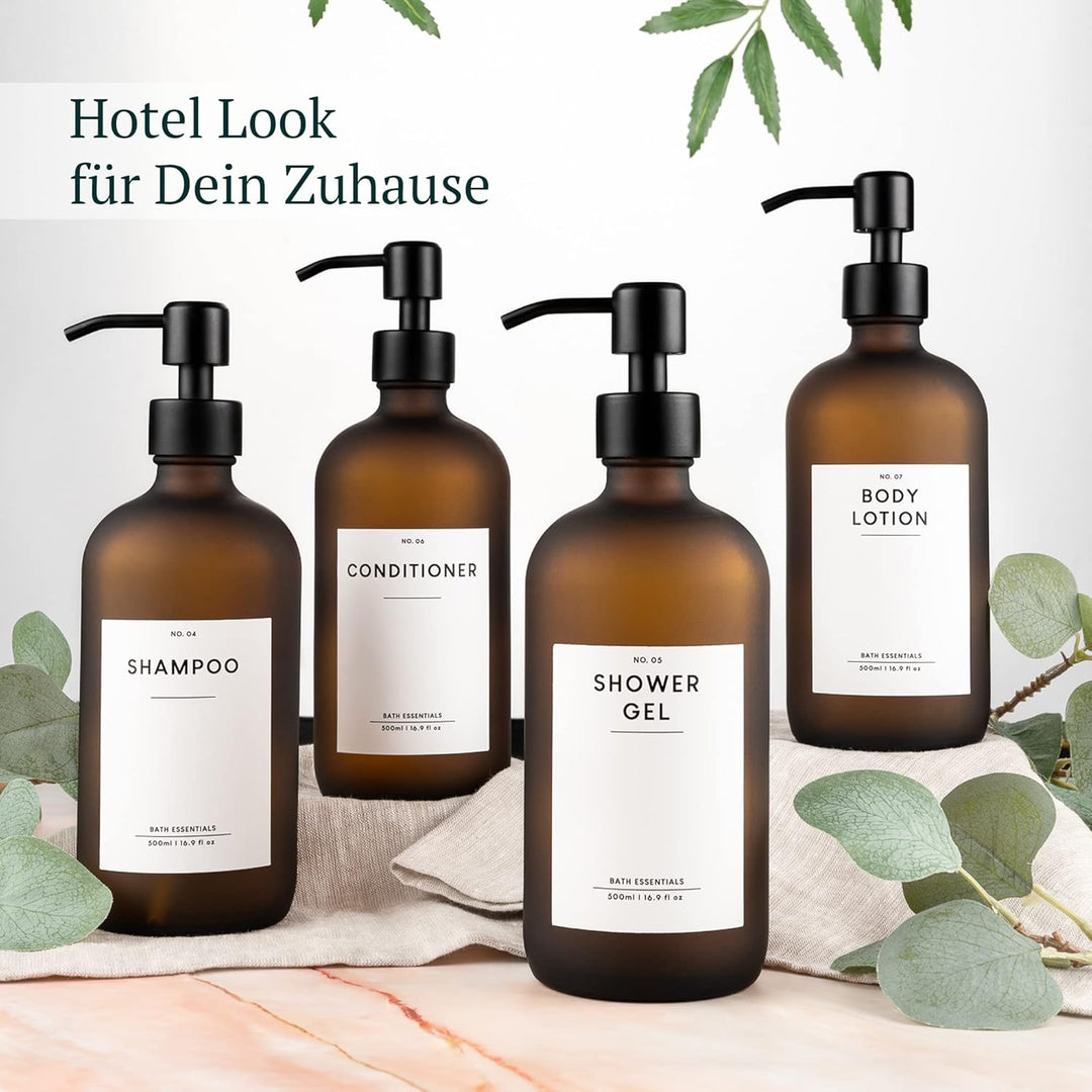 - * DEIN SET Beinhaltet 4 x Flasche aus Glas 500ml + 4 x Pumpkopf mit edelstahl ummantelung + 20 wasserfeste vinyl Aufkleber. Die Flaschen inklusive Pumpkopf sind 21 cm hoch und haben einen Durchmesser von 7,5cm.