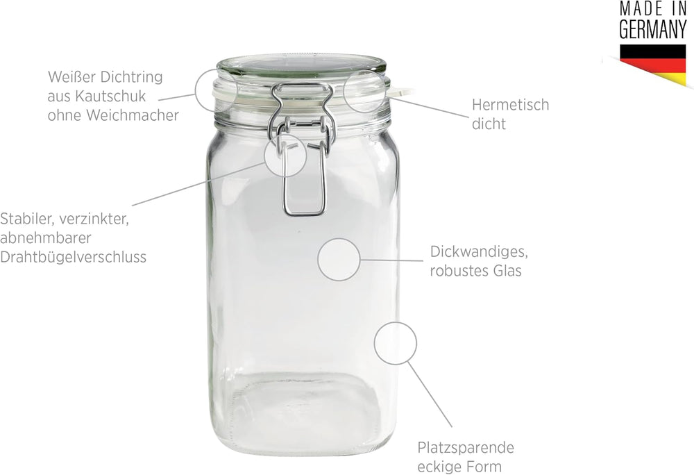 - Set aus 6 x Einmachglas bzw. Aufbewahrungsglas à 1, 45 l Füllvolumen. Dickwandiges Glas, stabiler und verzinkter Bügelverschluss, weisser Dichtring aus Kautschuk ohne Weichmacher