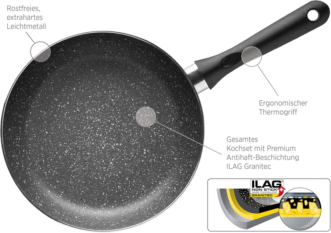 • Alle Töpfe (inkl. Stieltopf) und die im Set enthaltene Pfanne sind induktionsgeeignet sowie antihaft-beschichtet mit der besonders abriebbeständigen, keramisch verstärkten Granitec-Beschichtung der Schweizer Marke ILAG