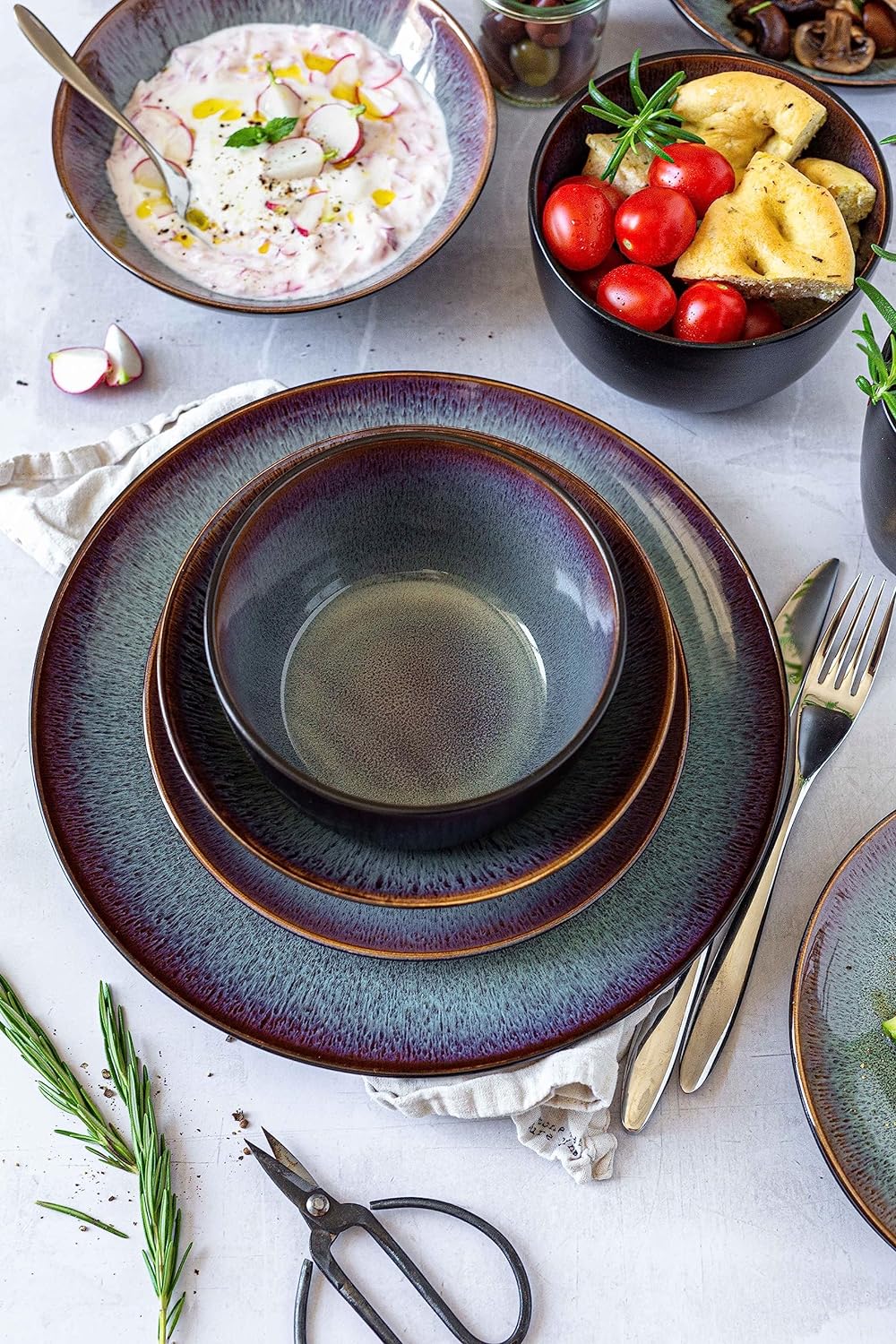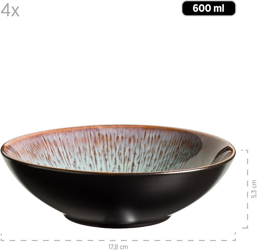 - Aufregend glasiertes Tellerset für 4 Personen aus Steinzeug mit einer besonderen Kombination aus Reaktivglasur und mattschwarzer Aussenglasur, Ø 17,8 cm