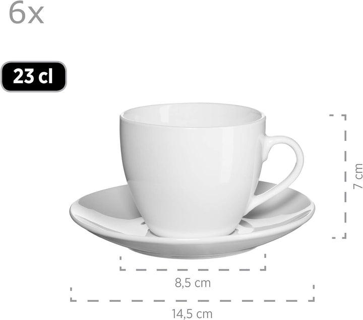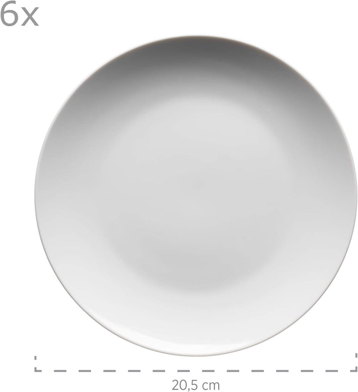 - Dieses 30-teilige Service Set für 6 Personen aus Porzellan in Weiss besteht aus 6x Essteller flach (Ø 24 cm), 6x Suppenteller tief (Ø 20 cm), 6x Dessertteller bzw. Frühstückteller (Ø 20,5 cm), 6x Kaffeetasse (230 ml Füllmenge) und 6x