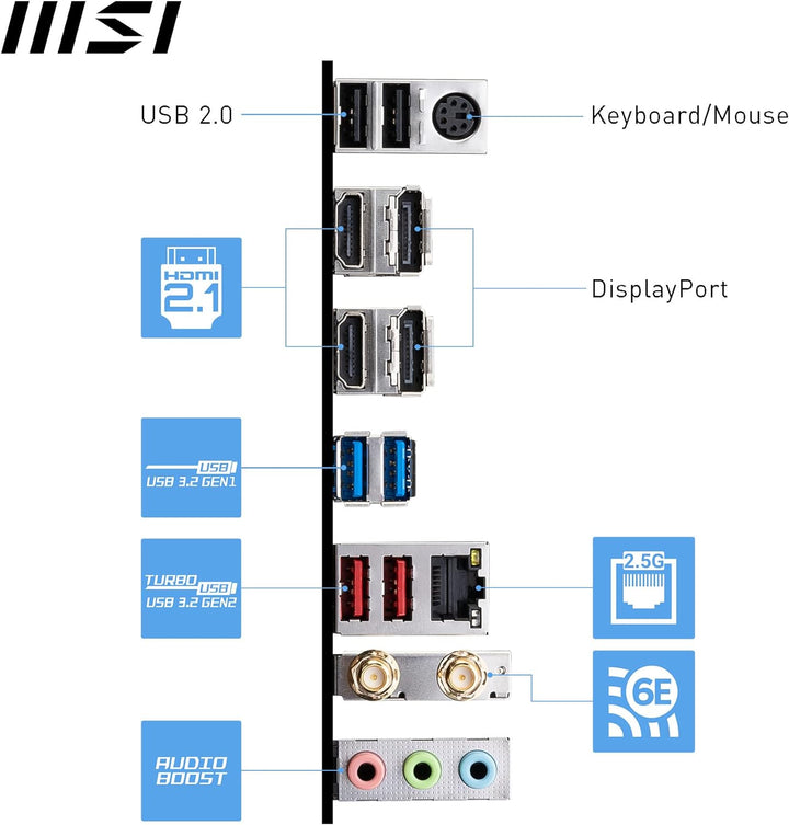 • WI-FI 6E - Die Netzwerkhardware umfasst ein Intel Wi-Fi 6E Modul mit Bluetooth 5.3 & 2,5Gbps LAN; Anschlüsse auf der Rückseite umfassen USB 3.2 Generation 2 Typ-A (10Gbps), 2 x HDMI 2.1 & 2 x DisplayPort 1.4, und 7.1 HD Audio mit Audio Boost