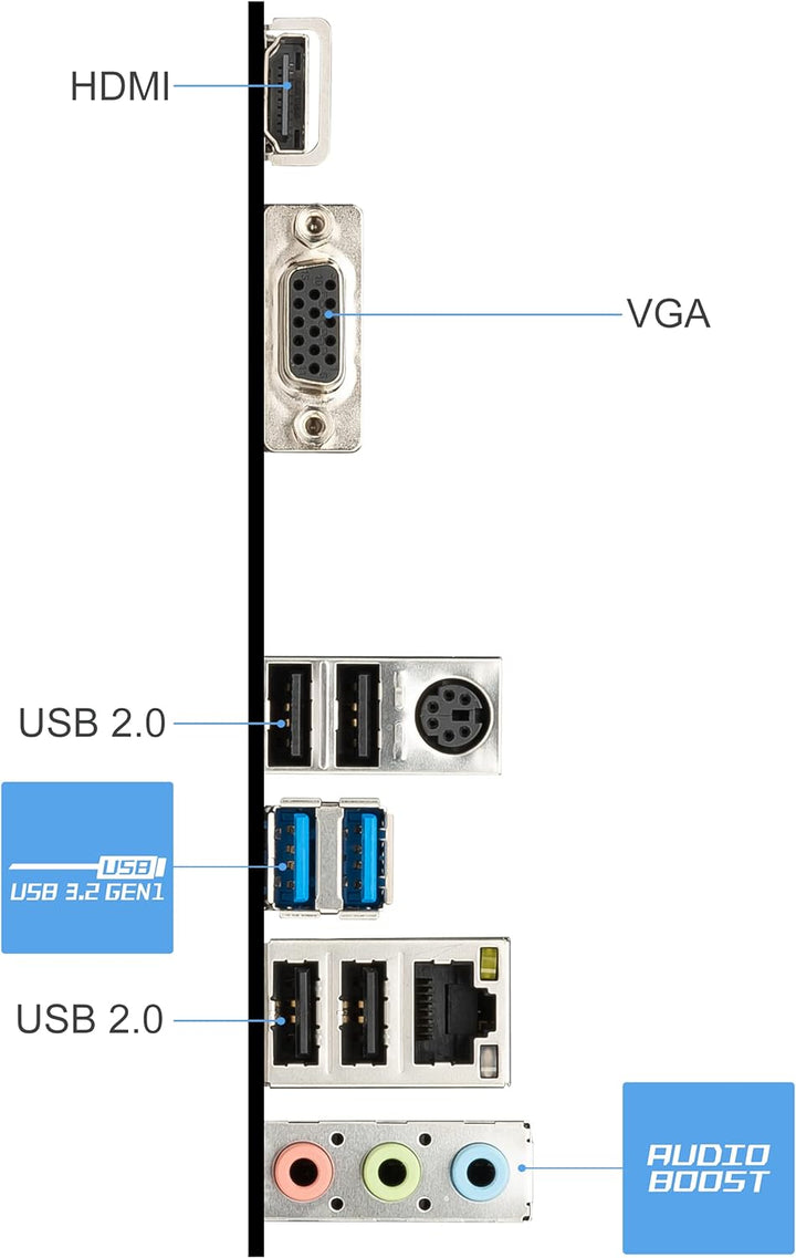 - 1G KONNEKTIVITÄT - Mit Intel I219-V 1G-LAN. Zu den festen Anschlüssen zählen VGA sowie die neuesten HDMI 2.1-Anschlüsse (4K/60Hz) - erfordert CPU mit integrierter Grafik; 4 x USB 3.2 Gen 1 Typ-A (5Gbits) und 7.1 HD Audio mit Audio Boost