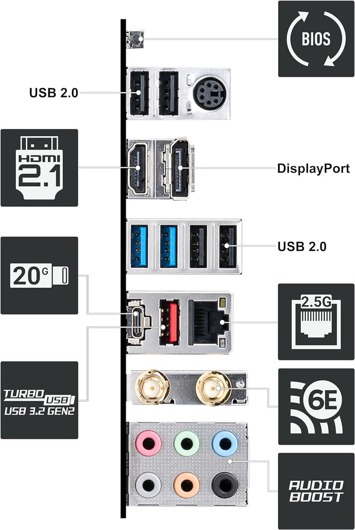 - WI-FI 6 KONNEKTIVITÄT - Mit Intel Wi-Fi 6, Bluetooth 5.2 & Intel I225V 2.5Gbits LAN; Anschlüsse auf der Rückseite umfassen USB 3.2 Gen 2x2 Typ-C (20Gbits), HDMI 2.1 & DisplayPort 1.4 und 7.1 HD Audio mit Audio Boost 5 (unterstützt S/PDIF-Ausgang)