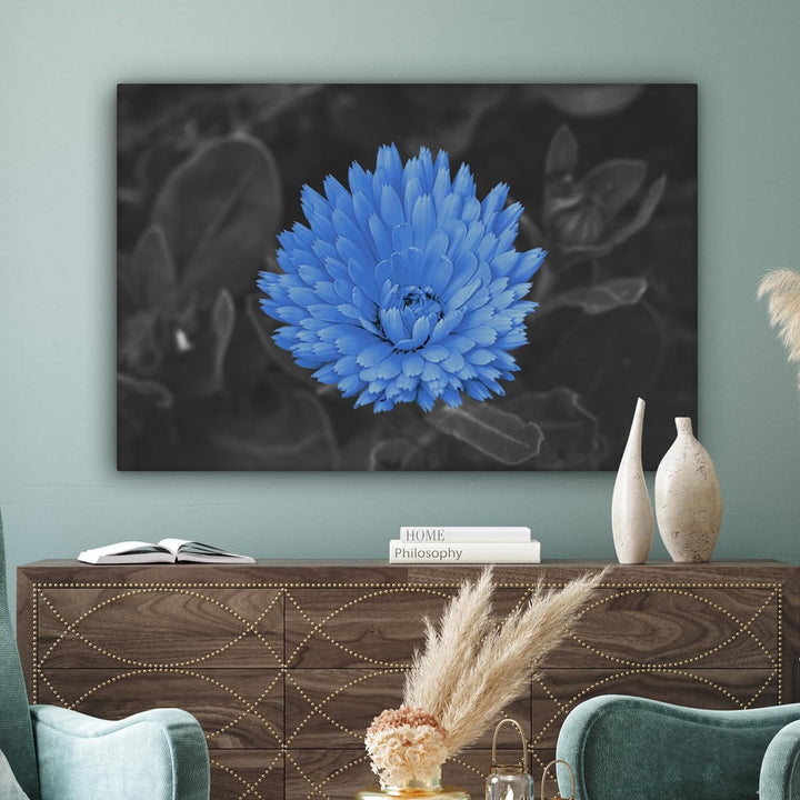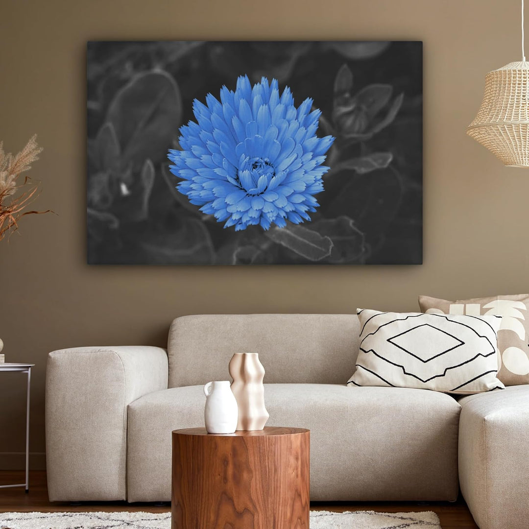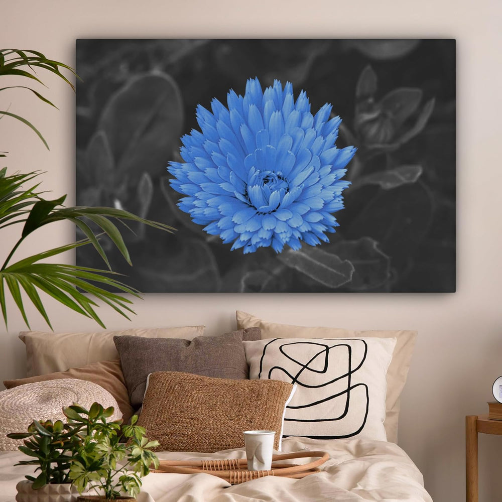 MuchoWow Leinwand Bilder, Einzigartige Wanddeko mit Rahmen, Blumen - Schwarz - Weiss - Blau, Wandbil