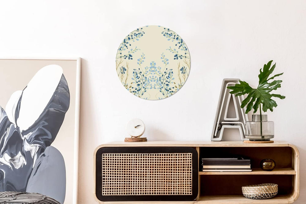 MuchoWow Wandbild Rund Wanddeko Deko Wohnzimmer Bilder 30x30 cm Blau - Beige - Pastell - Blätter, 30