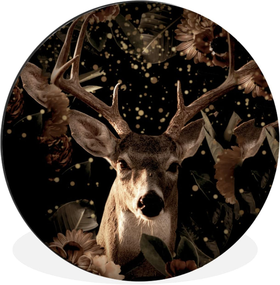MuchoWow Wandbild Rund Wanddeko Deko Wohnzimmer Bilder 90x90 cm Hirsche - Blumen - Licht - Botanisch