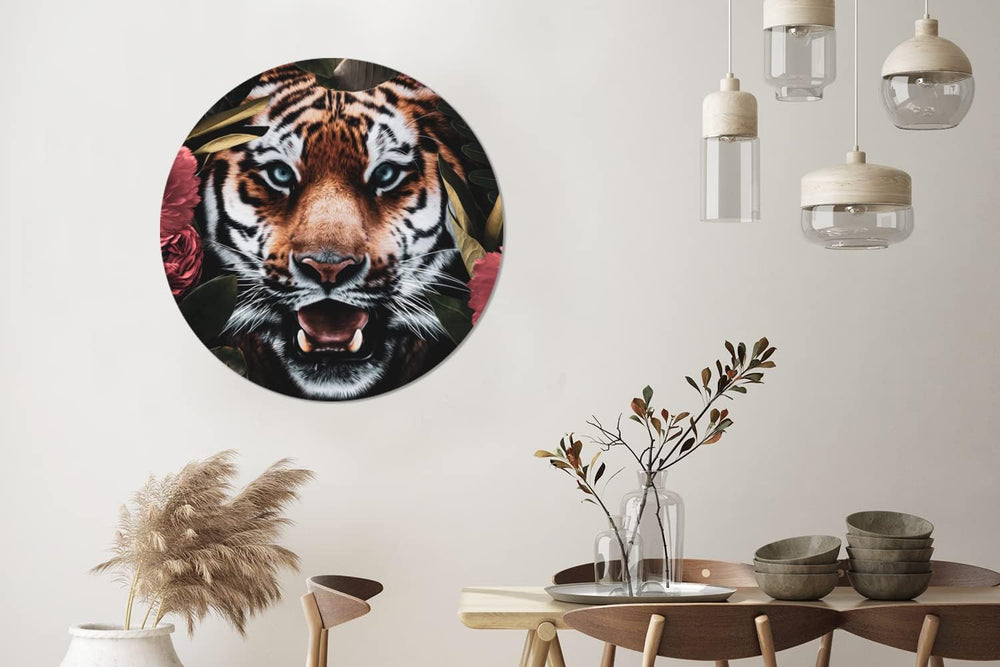 MuchoWow Wandbild Rund Wanddeko Deko Wohnzimmer Bilder 90x90 cm Tiger - Blumen - Dschungel, 90x90 cm