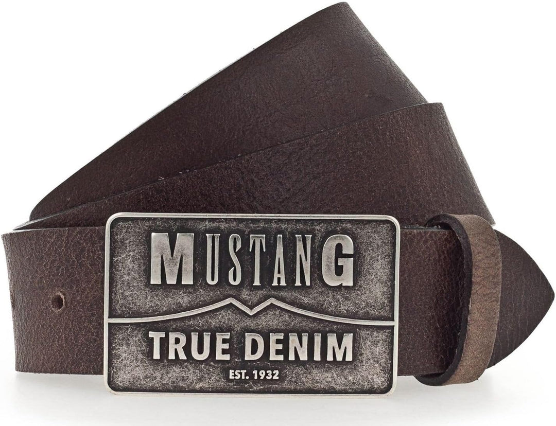 PRODUKTBESCHREIBUNGEN MUSTANG Gürtel mit schicker Schnalle Daten Gürtel: o Grösse: Weite ca. 98 cm - ca. 112 cm (W105) o Masse: Breite ca. 4 cm, Stärke 0,3 cm o Gewicht: ca. 190 g o Farbe: Dark Brown (Braun) o Material: 100% Leder o Lieferumfang: MUSTANG Gürtel mit Etikett Ausstattung Gürtel: o Gürtel wird mit Dornschliesse geschlossen o 6 gestochene Löcher o Das MUSTANG Logo ist gut sichtbar eingearbeitet MUSTANG Classic Leather Belt W105 - Ein schicker Gürtel modebewusste Herren Dieser Gürtel von der Marke MUSTANG erfüllt nicht nur seinen Zweck und bewahrt Sie vor rutschender Kleidung, sondern sieht auch noch total schick aus. Mit ihm an Ihrer Seite haben Sie einen langfristigen Begleiter gefunden, denn er ist aus hochwertigem Leder gefertigt und wird Ihnen so treu zur Seite stehen. Mit der tollen Schnalle können Sie Ihrem Look tolle Akzente setzen und haben so ein weiteres Highlight an Ihrem Outfit, das Sie zum Leuchten bringt. Der MUSTANG Classic Leather Belt in der Weite 105 ist also nicht nur praktisch, sondern auch stylisch. Hier treffen Sie einfach die richtige Wahl!