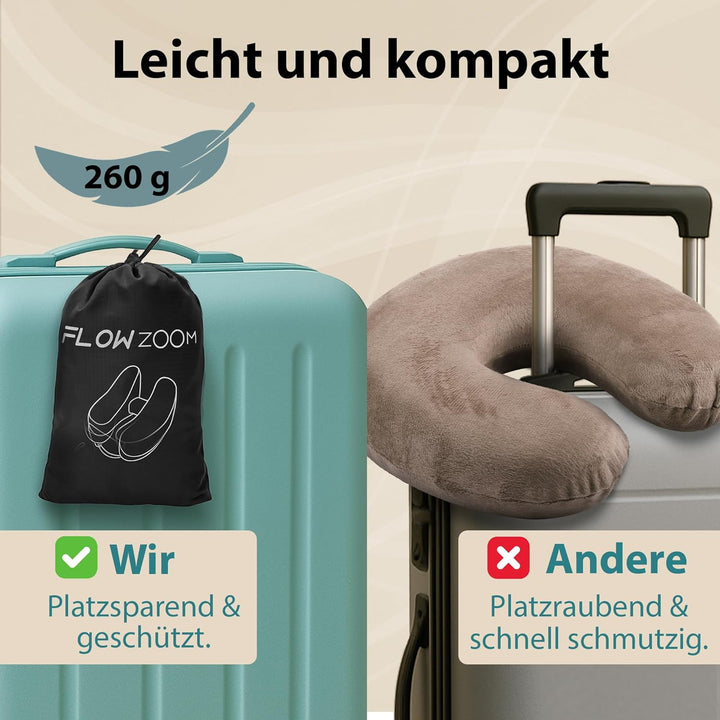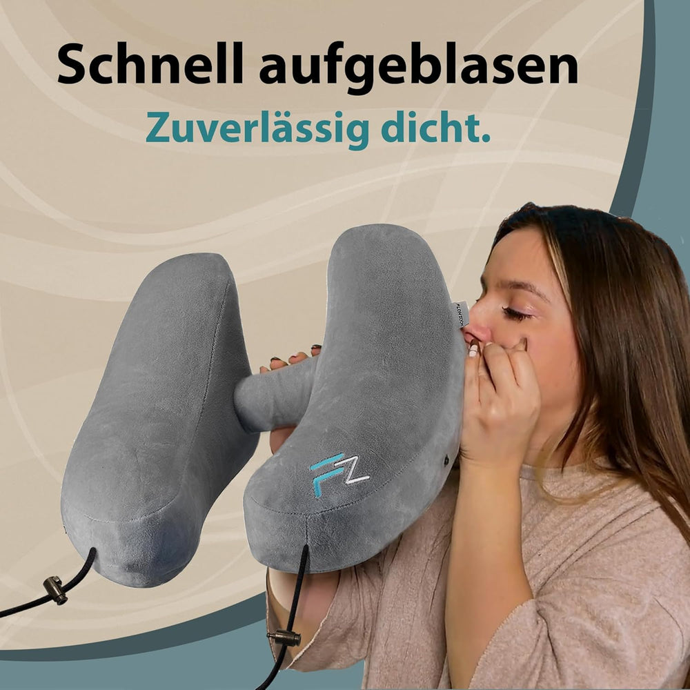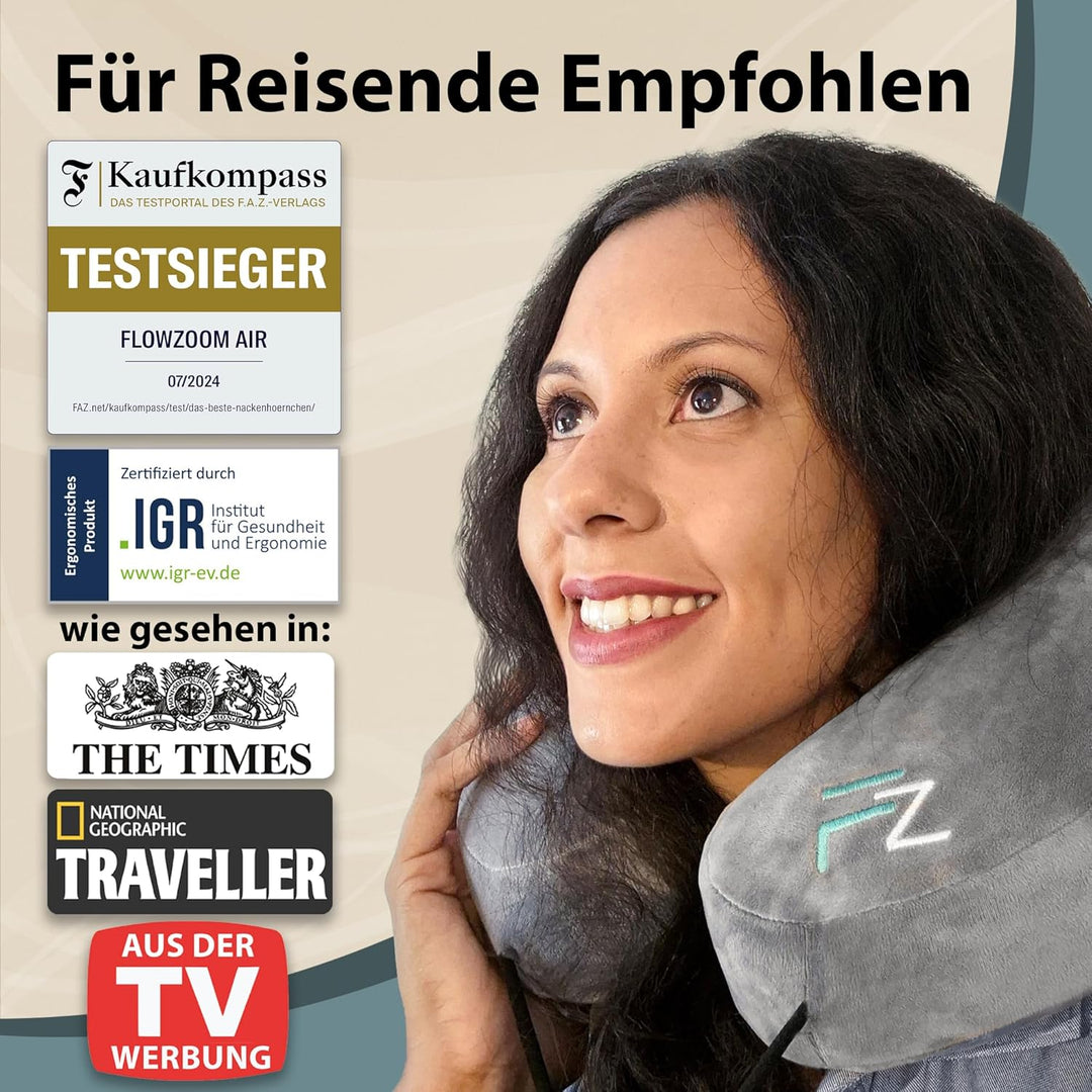 - Einzigartig! Der Kopf wird beim Zurücklehnen im Flugzeug, Zug oder Auto NICHT NACH VORNE GEDRÜCKT – dies ermöglicht der abgeflachte schmale Nackensteg; ausserdem kann der KOPF NICHT NACH VORNE KNICKEN ODER FALLEN und das KINN WIRD ANGENEHM GESTÜTZT; die einzigartige H-Form des aufblasbaren FlowZoom Nackenkissens ermöglicht BIS ZU 5 VERSCHIEDENE SCHLAFPOSITIONEN - je nach Vorliebe des Einzelnen! Mit Sicherheit eine angenehme Erholung auf langen Reisen!