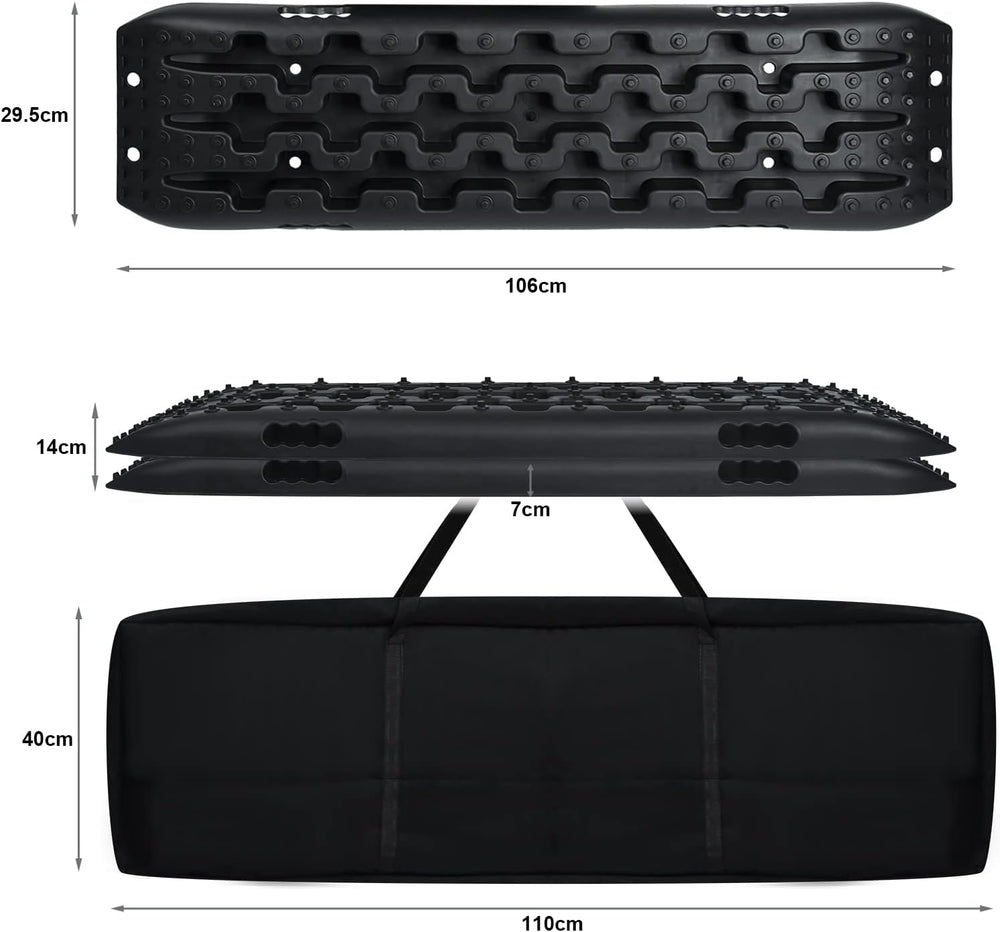- Recovery-Board Traktionsmatte -- Es gibt insgesamt 2 Stück mit einer Grösse von jeweils 106 x 29,5 x 7 cm, die ein Gesamtgewicht von 10 t tragen können, und das Gesamterscheinungsbild ist schwarz. Ob Familienauto, Geländewagen, LKW oder Wohnmobil, es