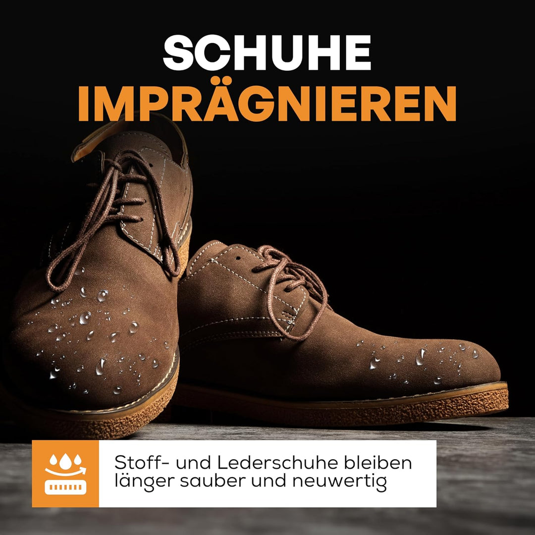 • Spray zum Imprägnieren von Textilien, wie Schuhe, Polster, Tischwäsche, Mäntel, Leder, Wildleder, Cabrio-Dach und alle anderen Arten von Stoffen. Das wasserabweisende Impägnierspray ummantelt jede einzelne Faser mit Nanopartikeln.