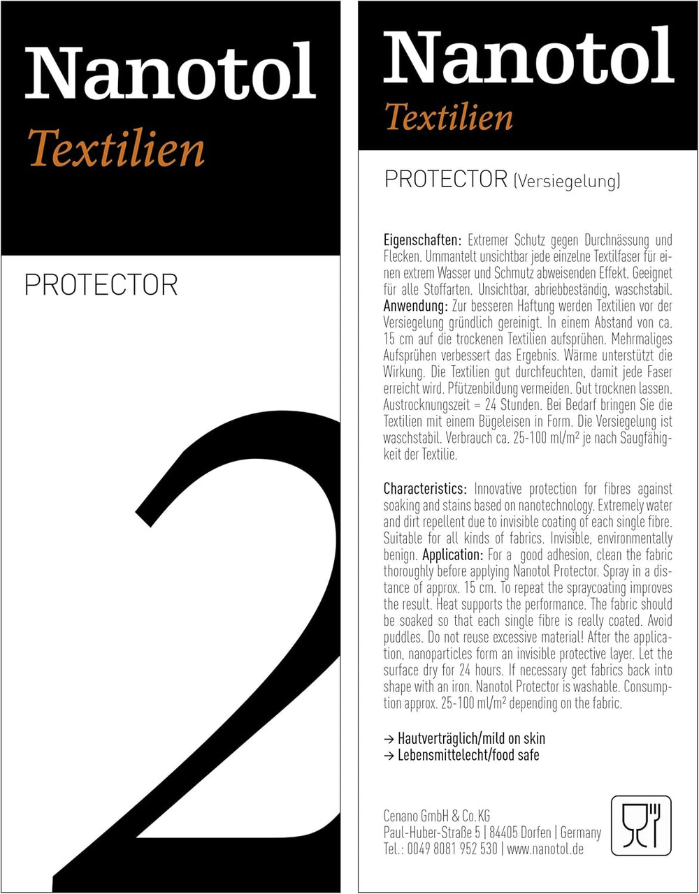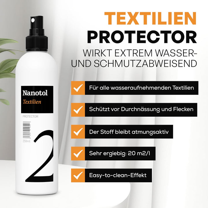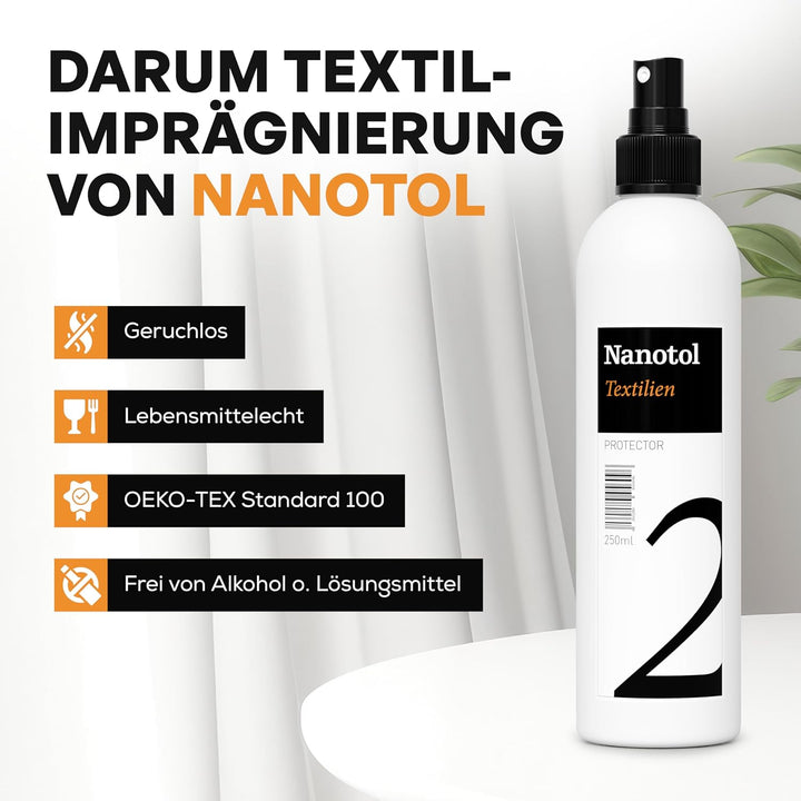 • Einfache Anwendung: Sprühen Sie Nanotol Textilien Protector auf den Stoff, bis Sie das Gefühl haben, dass alle Fasern von der Flüssigkeit erreicht wurden. Nach 24 h Trockenzeit ist die Flüssigkeit getrocknet und die Nanopartikel bleiben dauerhaft