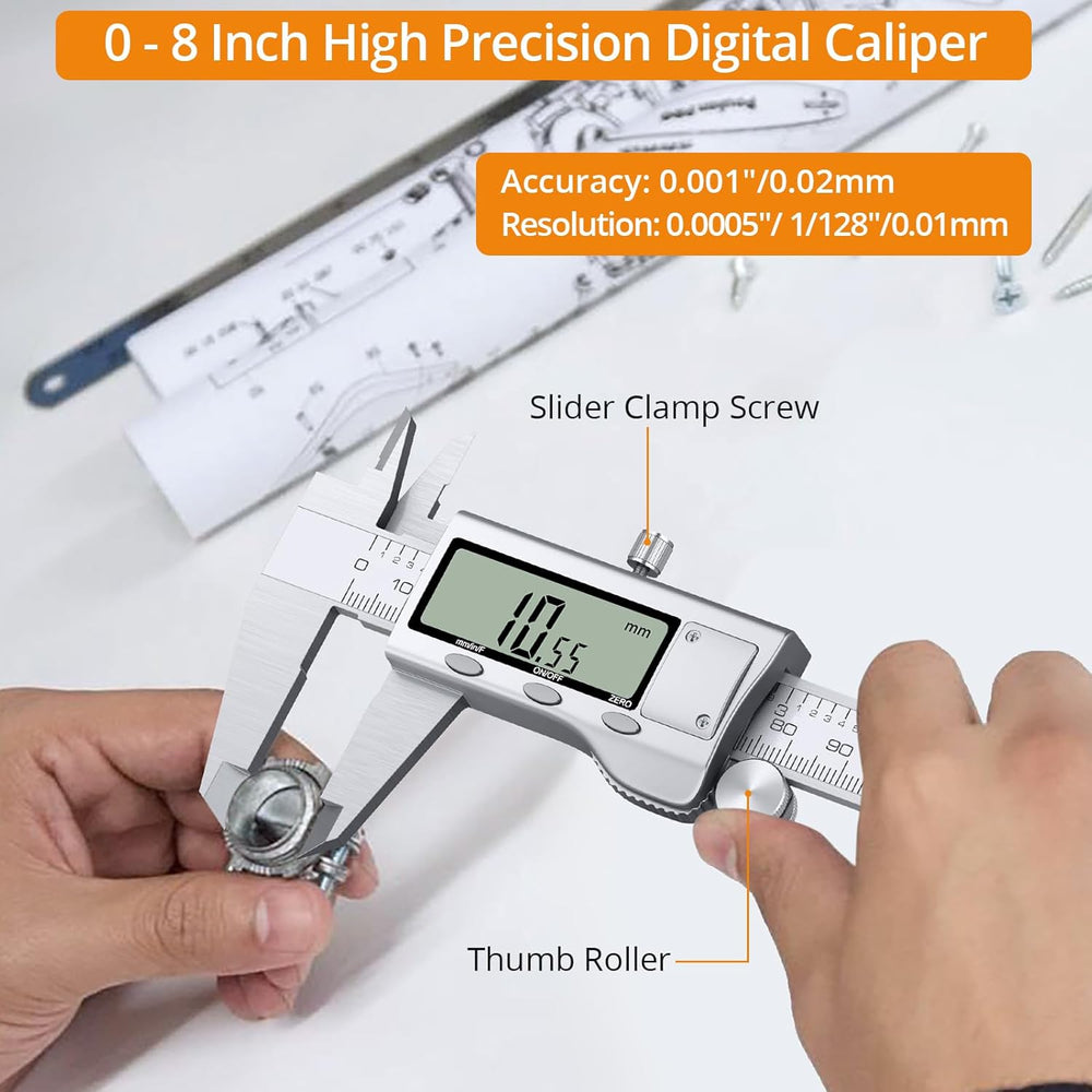 - 8 Zoll/200 mm digitaler Messschieber. Die Auflösung beträgt bis zu 0,0005/1/128/0,01 mm; Genauigkeit: 0,001/0,02 mm, bietet Ihnen präzise Messwerte