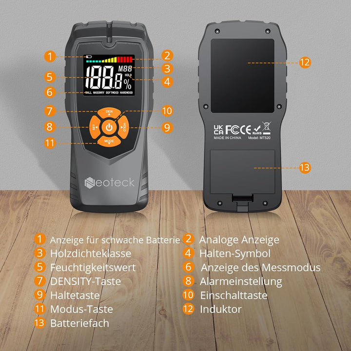 - 【Einfach zu bedienen und ergonomisches Design】Das stiftlose Feuchtigkeitsmessgerät von Neoteck ist benutzerfreundlich und verfügt über praktische Funktionen. Es hat einen Alarm ausserhalb des Bereichs, eine HOLD-Taste, eine automatische