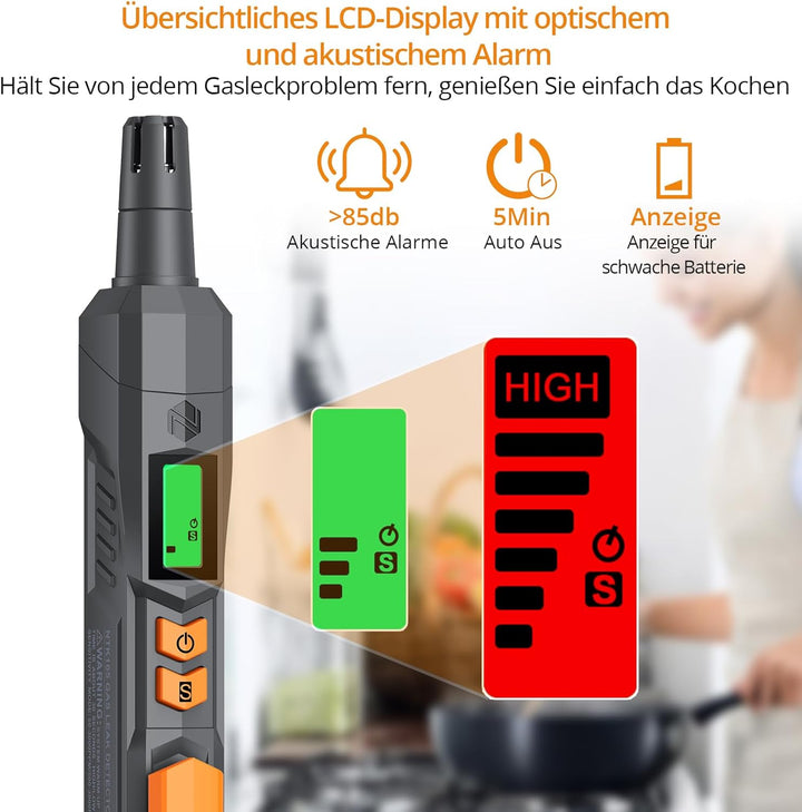 - 【Visueller und akustischer Gasalarm】 Das Gaswarngerät verwendet sowohl einen visuellen als auch einen akustischen Alarm mit einer Erkennung von nur 0,5 Sekunden. Wenn sich das Balkendiagramm vergrössert und der Detektor piept, wissen Sie, dass Gas