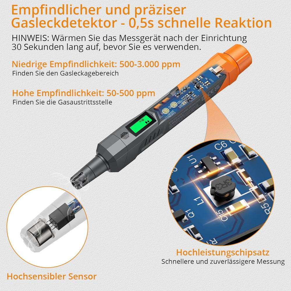 - 【Schneller und genauer Gasleckdetektor】 Der Erdgasdetektor eignet sich weitgehend für LPG, Methan, Ethan, Propan, Butan, Erdgas, Kohlegas, Gasbrennstoff, Flüssigerdgas usw. und lokalisiert ein Leck genau, verringert das Risiko einer Gasexplosion