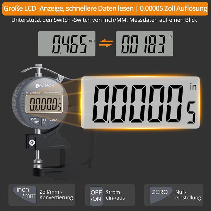 - 【0 ~ 12,7 mm Messbereich】 Messbereich von 0 ~ 12,7 mm (0 ~ 0,5 Zoll), hohe Auflösung bis zu 0,001 mm (0,00005 ")