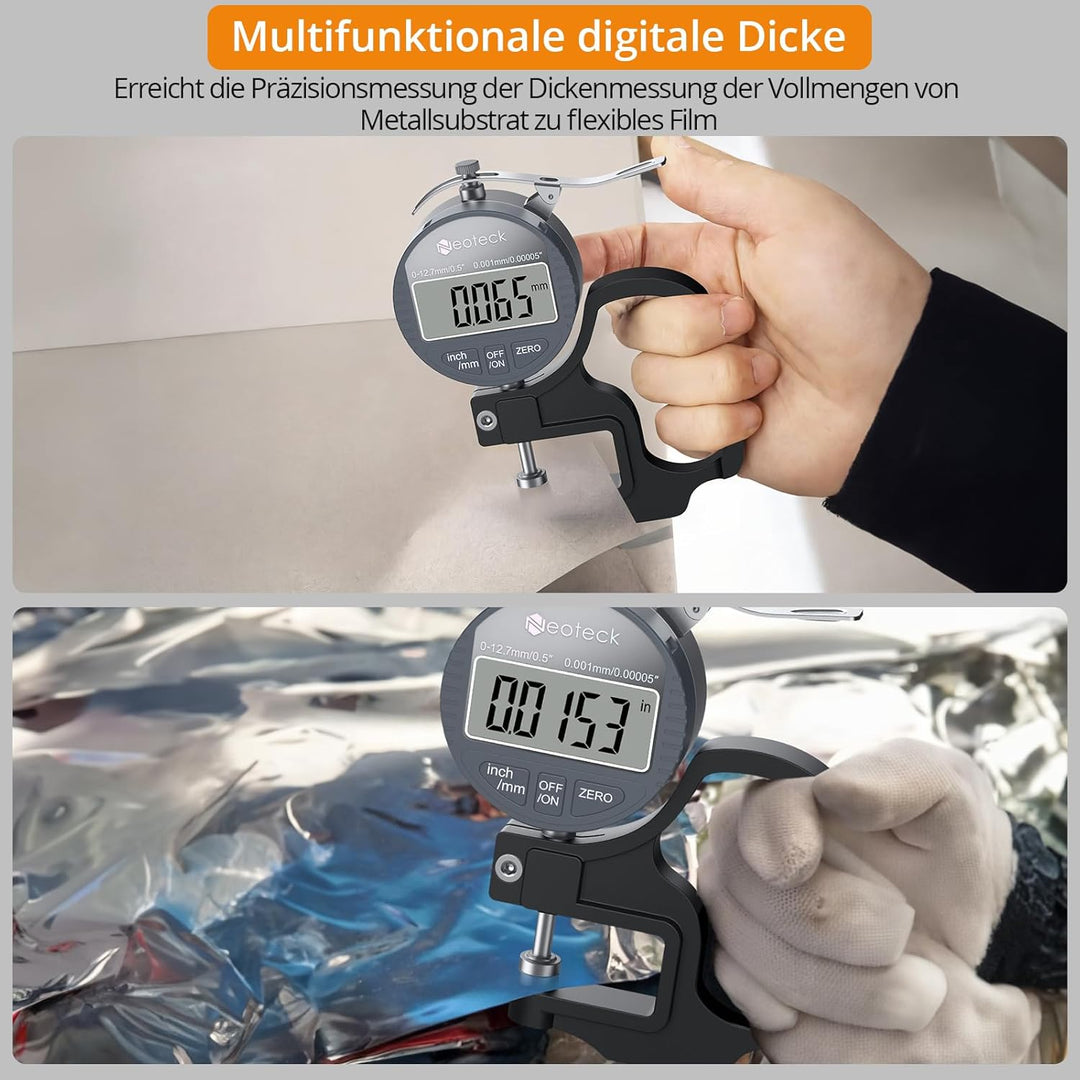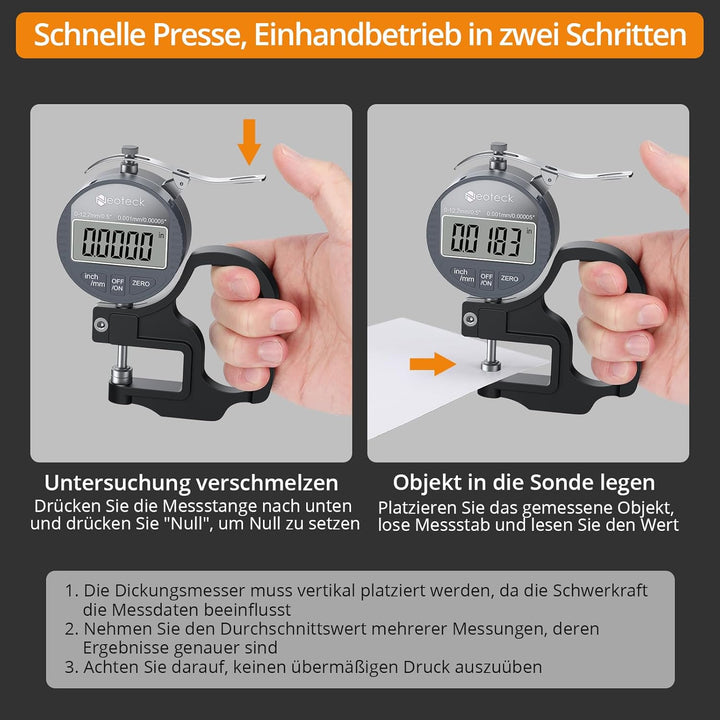 - 【Digitales Dickenmessgerät】 Praktischer Griff, Daumenauslöser und gefederte Spindel. Dies ist ein ideales Werkzeug für mechanische Industrieprozesse und den Laborgebrauch