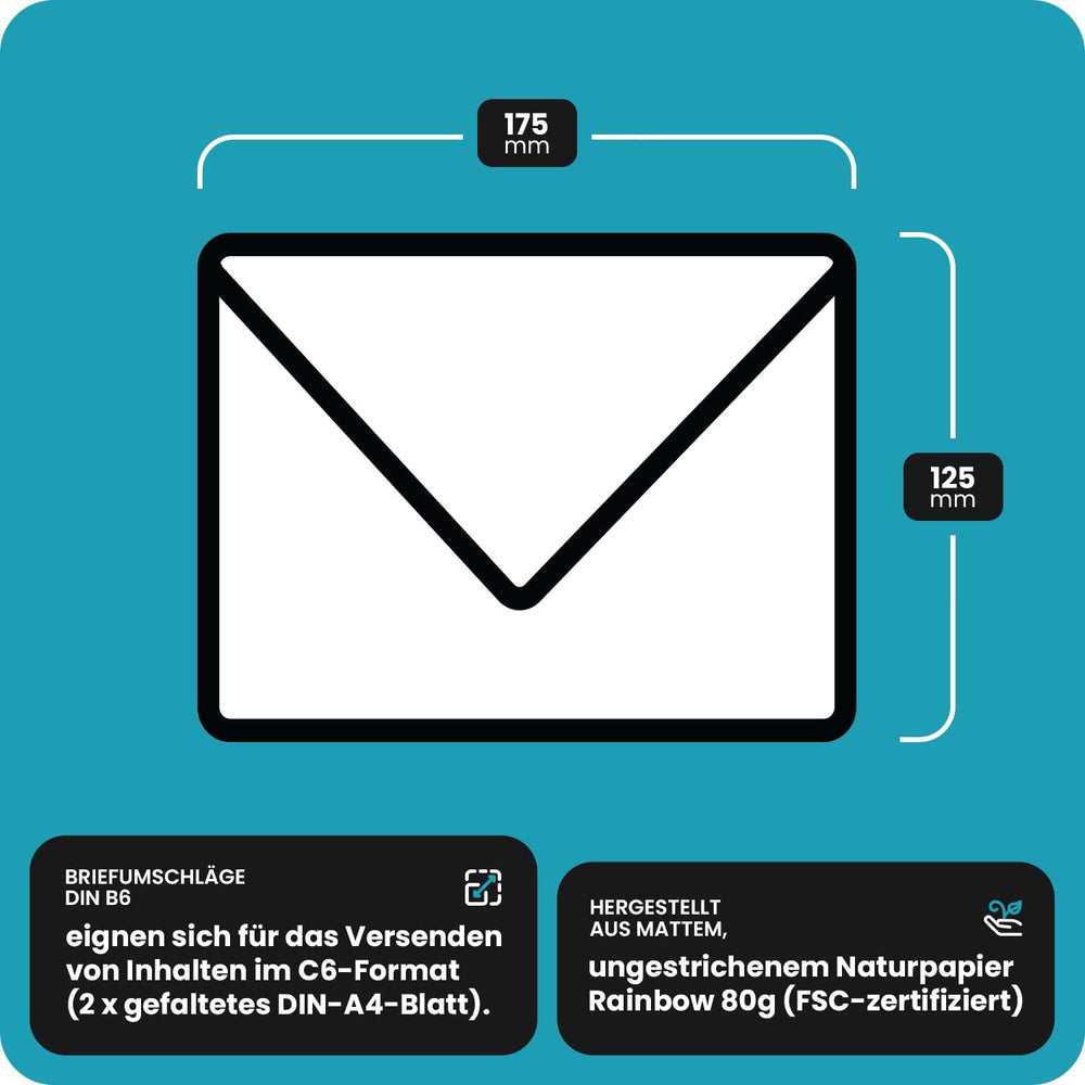 - TECHNISCHE SPEZIFIKATIONEN – 1000 Briefumschläge im DIN B6-Format (125x175 mm), ohne Fenster, Spitzklappe, Nassklebung, hergestellt aus ungestrichenem, mattem Naturpapier Rainbow 80g (mit FSC Zertifikat und EU-Ökolabel, elementar chlorfrei