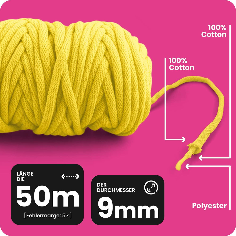 - TECHNISCHE DATEN – 1 Knäuel Baumwolle Garn, der Durchmesser 9mm, Länge die 50m; Kern aus Polyester. Die Farbe des angebotenen Produkts kann von der Farbdarstellung Ihres Monitors abweichen.