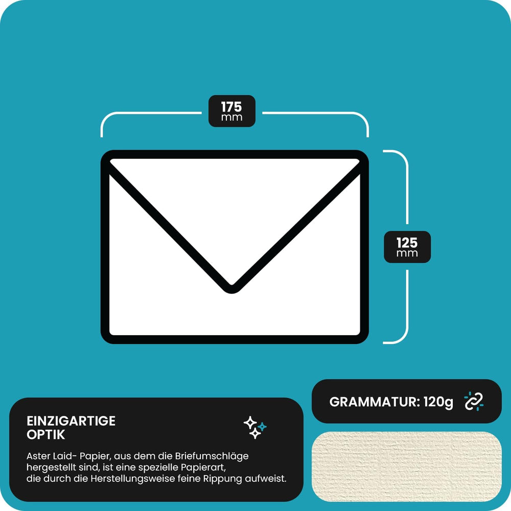 - EINZIGARTIGE OPTIK – Aster Laid- Papier, aus dem die Briefumschläge hergestellt sind, ist eine spezielle Papierart, die durch die Herstellungsweise feine Rippung aufweist. Dieser Effekt verleiht den Briefhüllen eine ganz eigene Optik.