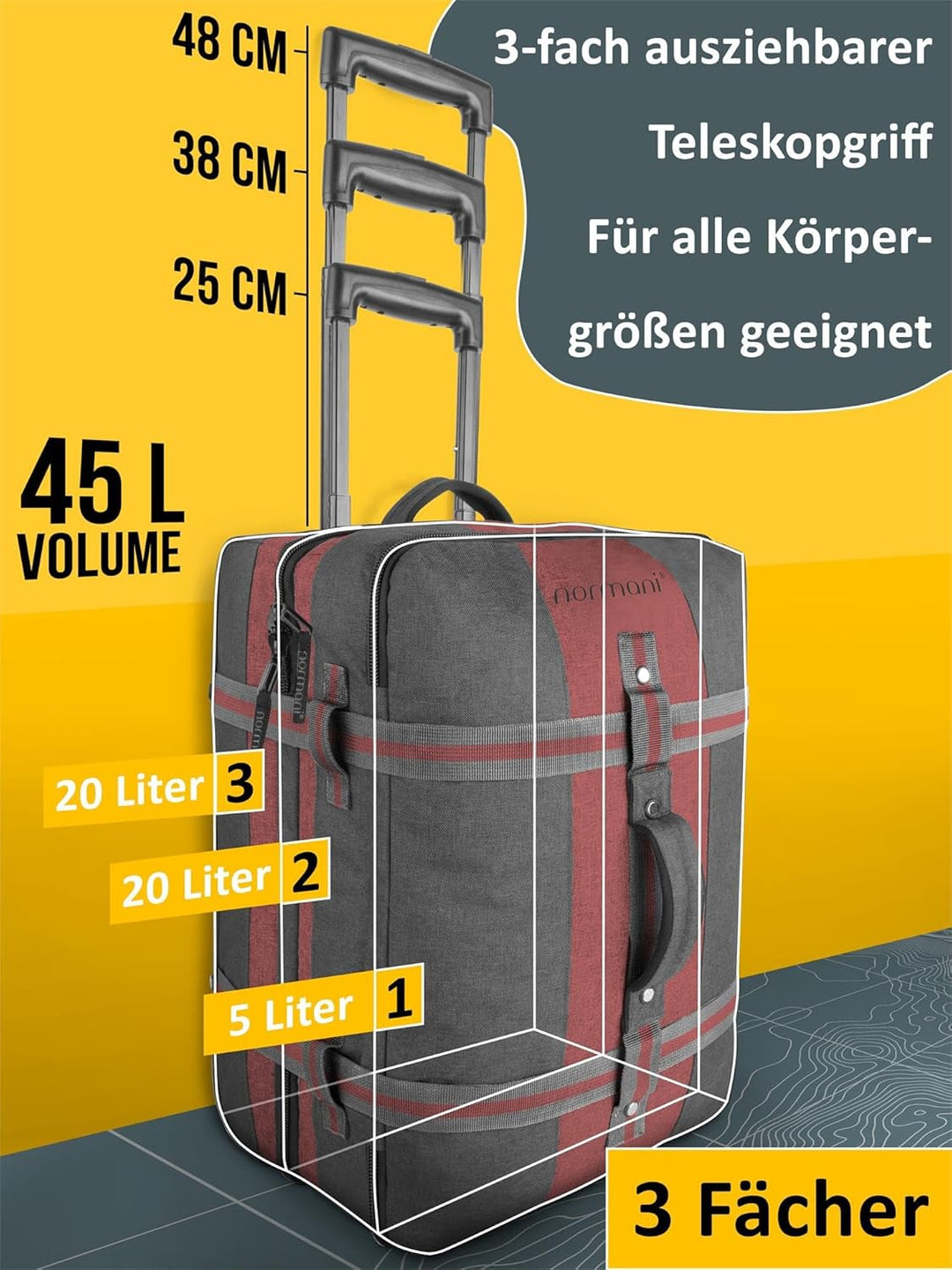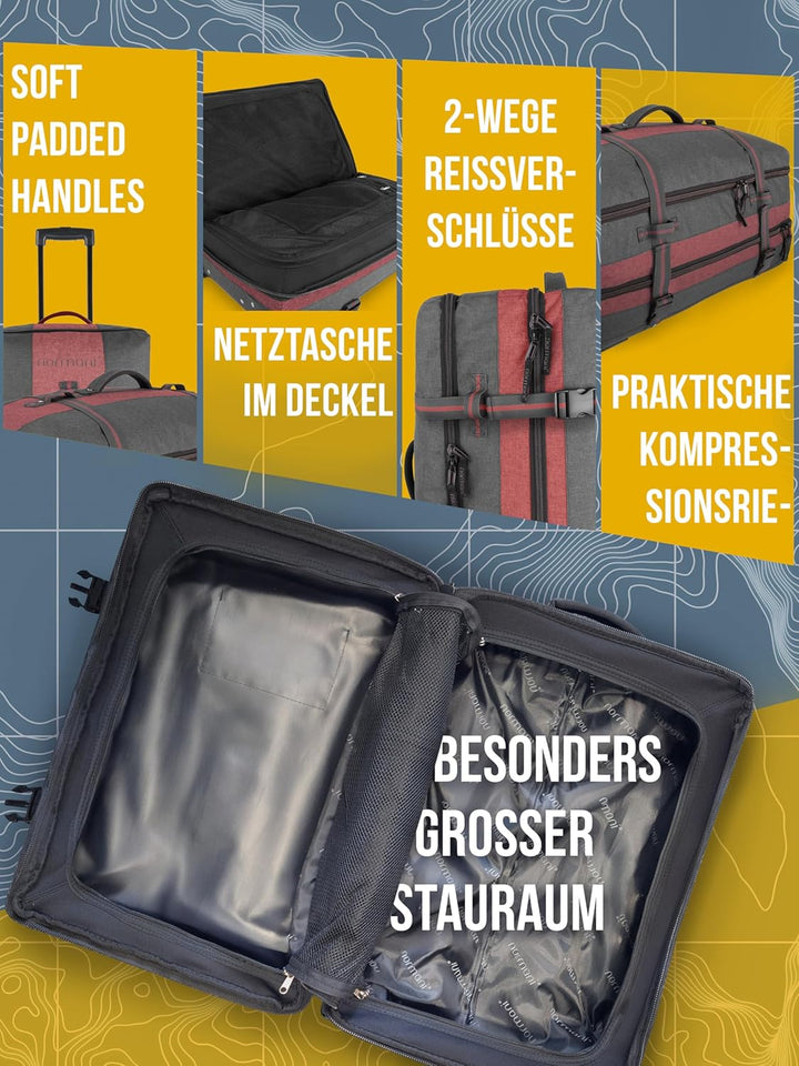 - Leichte und stabile Reisetaschemit 45 Liter Volumen verteilt auf 3 grosse Fächer