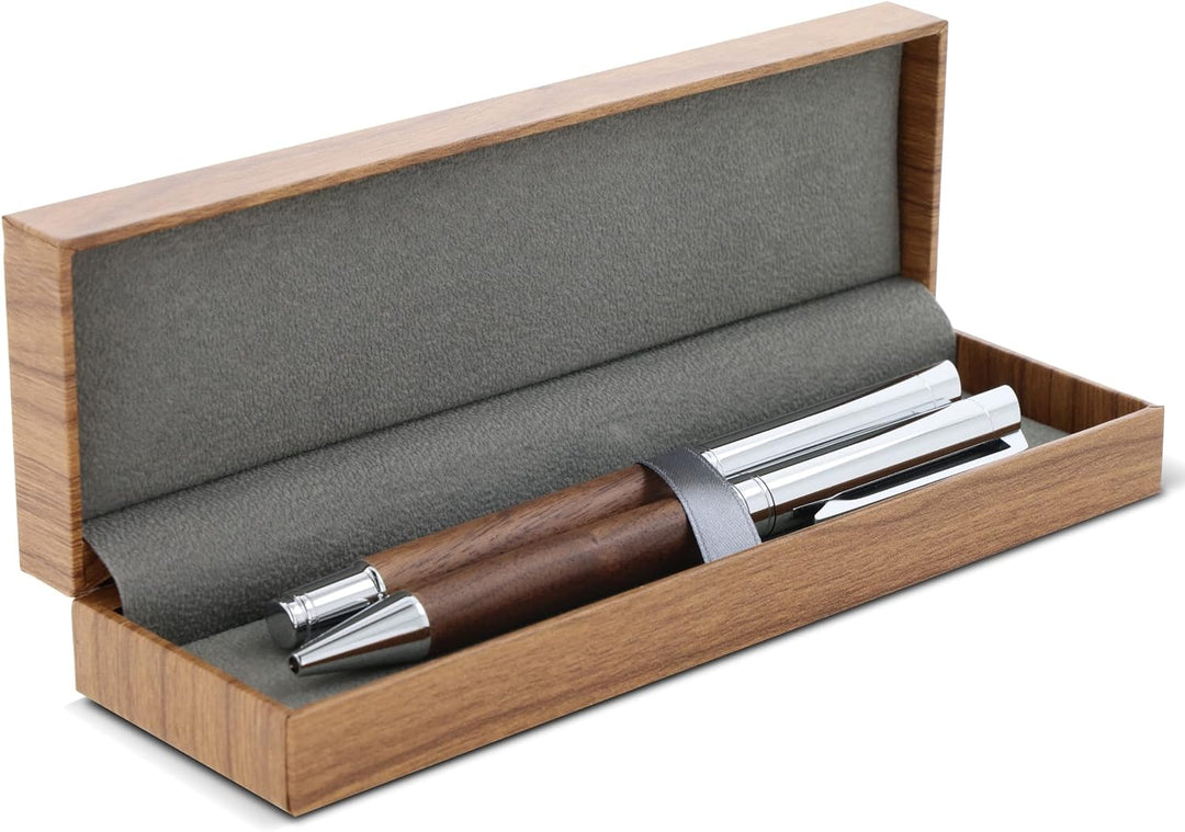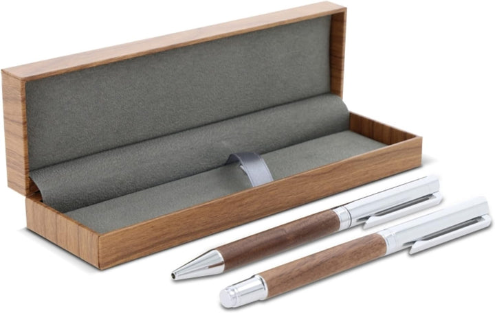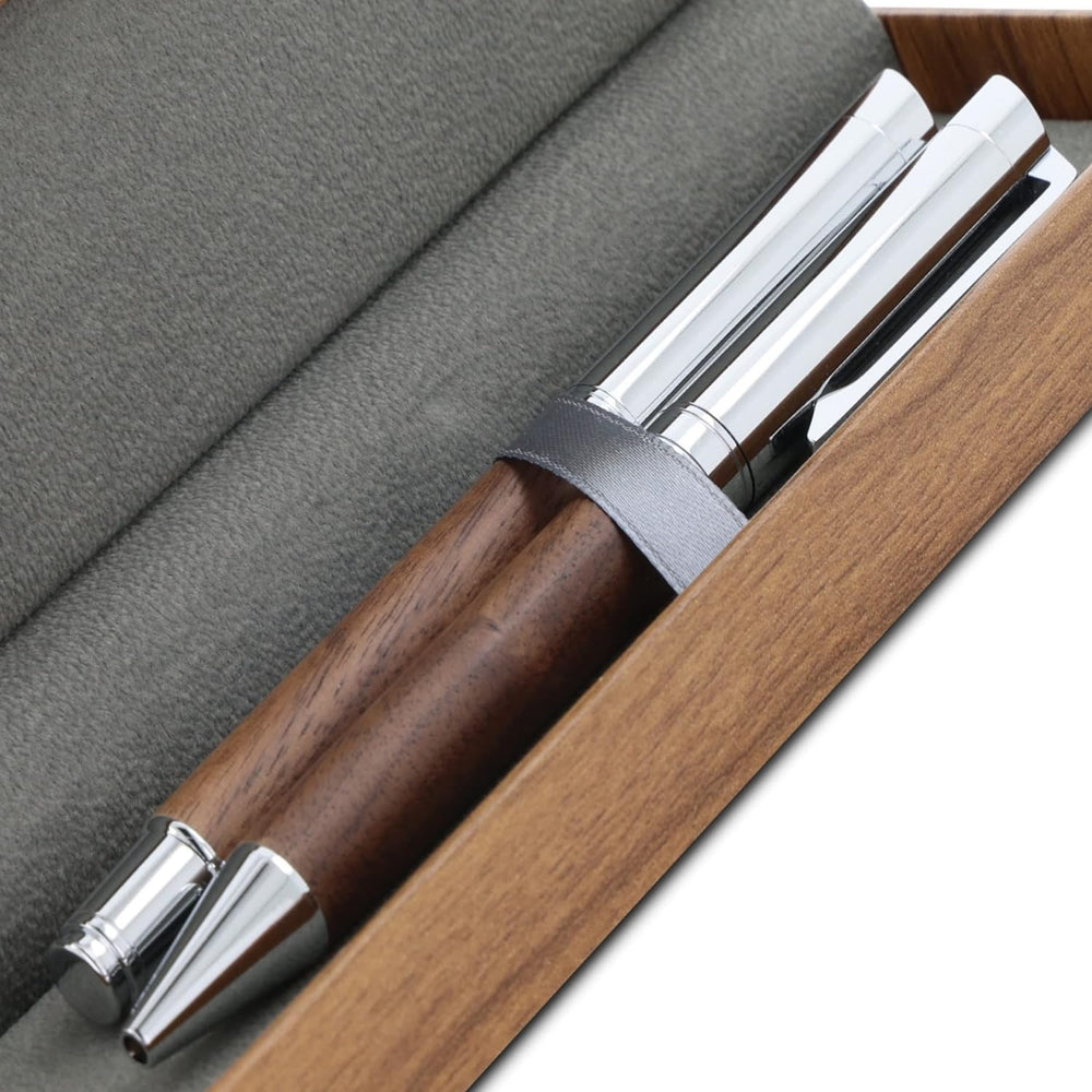 - HOCHWERTIGE AUSFÜHRUNG - Die Metallteile des Schreibsets sind aus langlebigem und glänzendem, verchromten Edelstahl gefertigt, während der Schaft vom Drehkugelschreiber und Tintenroller aus edlem Walnussholz gefertigt sind, das eine natürliche, warme
