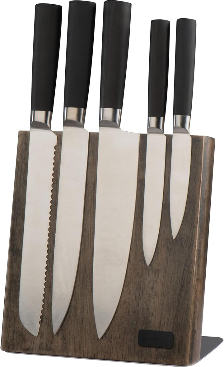 - die Messer verfügen jeweils über einen ergonomischen Griff und liegen so perfekt in der Hand, durch einen Magnet in der Holzplatte finden die Messer ihren Halt und sind so in der Küche ideal verstaut.
