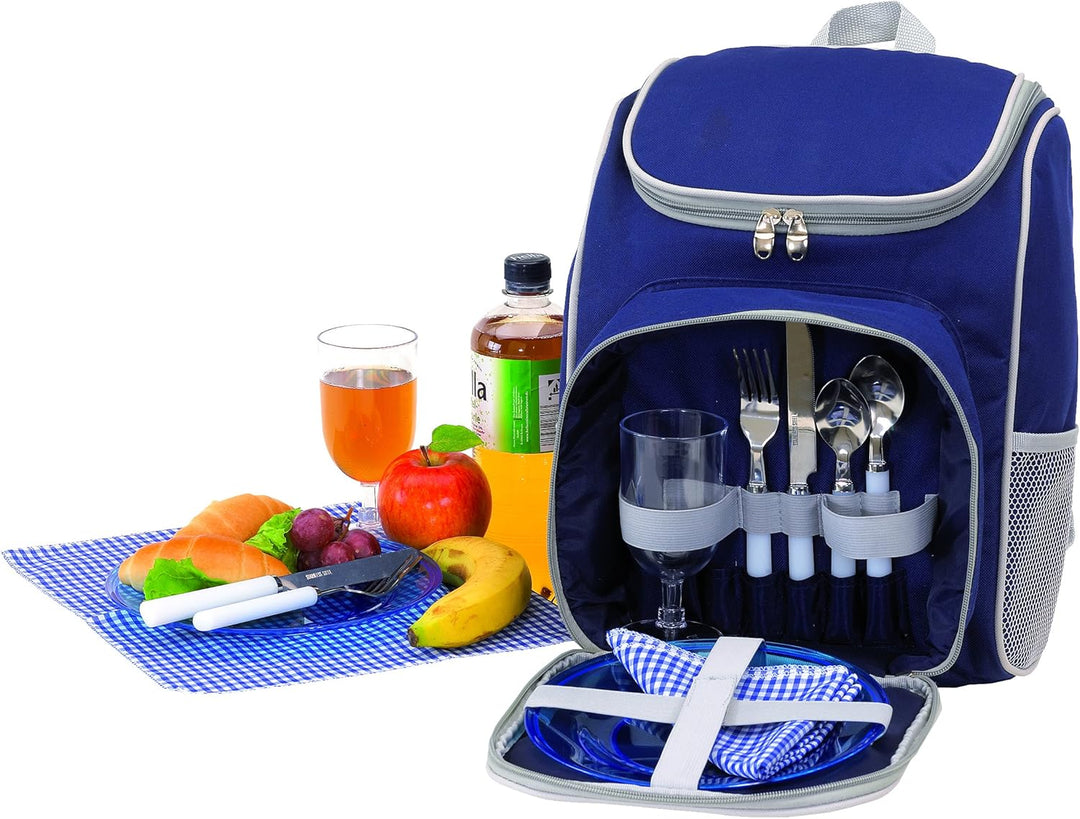 - je 2 Kunststoffgläser und -teller, 2 Stoffservietten und Besteck