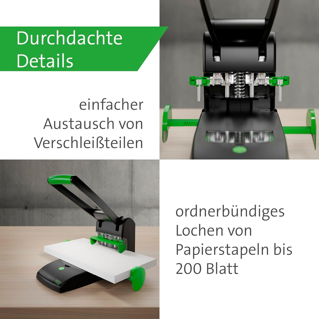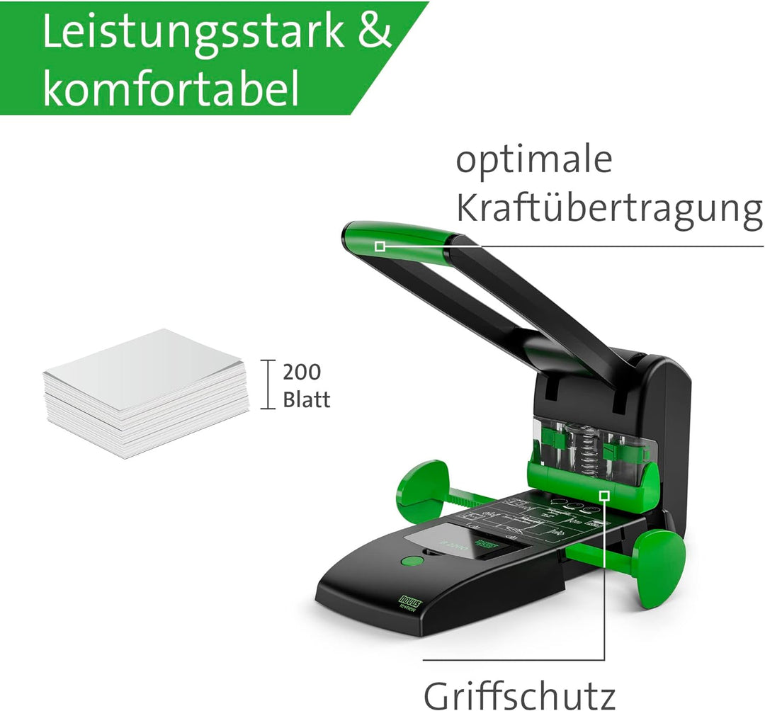 • Dank der verschiebbaren Justiereinheit locht der Locher für Ordner komfortabel sowohl zweifach als auch vierfach. Der Papierlocher hat eine hohe Stanzleistung von bis zu 200 Blatt Papier (80g/m²)