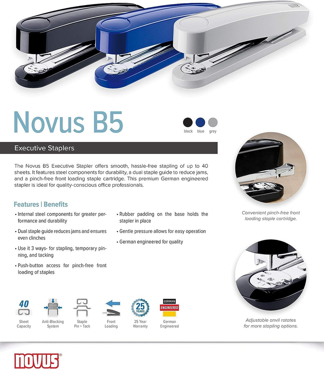 - Die wesentlichen Teile der Heftmaschine sind aus Metall, wodurch sie sehr stabil und robust ist. Die maximale Einlegtiefe von Papier beträgt 105 mm