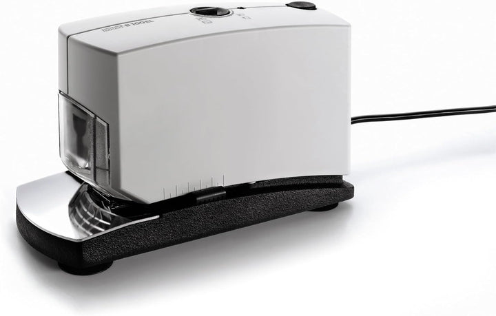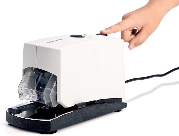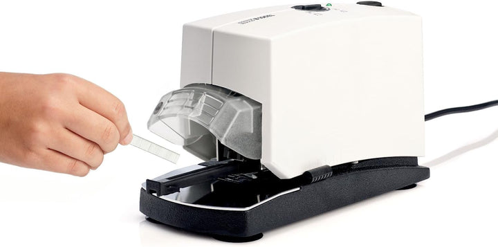 - Mit Springfachlademechanik: Der Klammerkanal springt per Knopfdruck zum Beladen automatisch auf. Der Elektrohefter kann Klammern des Typs NE 6 und NE 8 verarbeiten. Es können maximal 210 Stück eingelegt werden