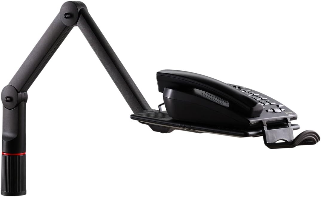 - Telefonhalterung zur Befestigung am Schreibtisch. Der 2-teilige Gelenkarm ist 360 Grad schwenkbar und lässt sich in drei festen Positionen einrasten. So kann das Telefon flexibel im Raum positioniert werden