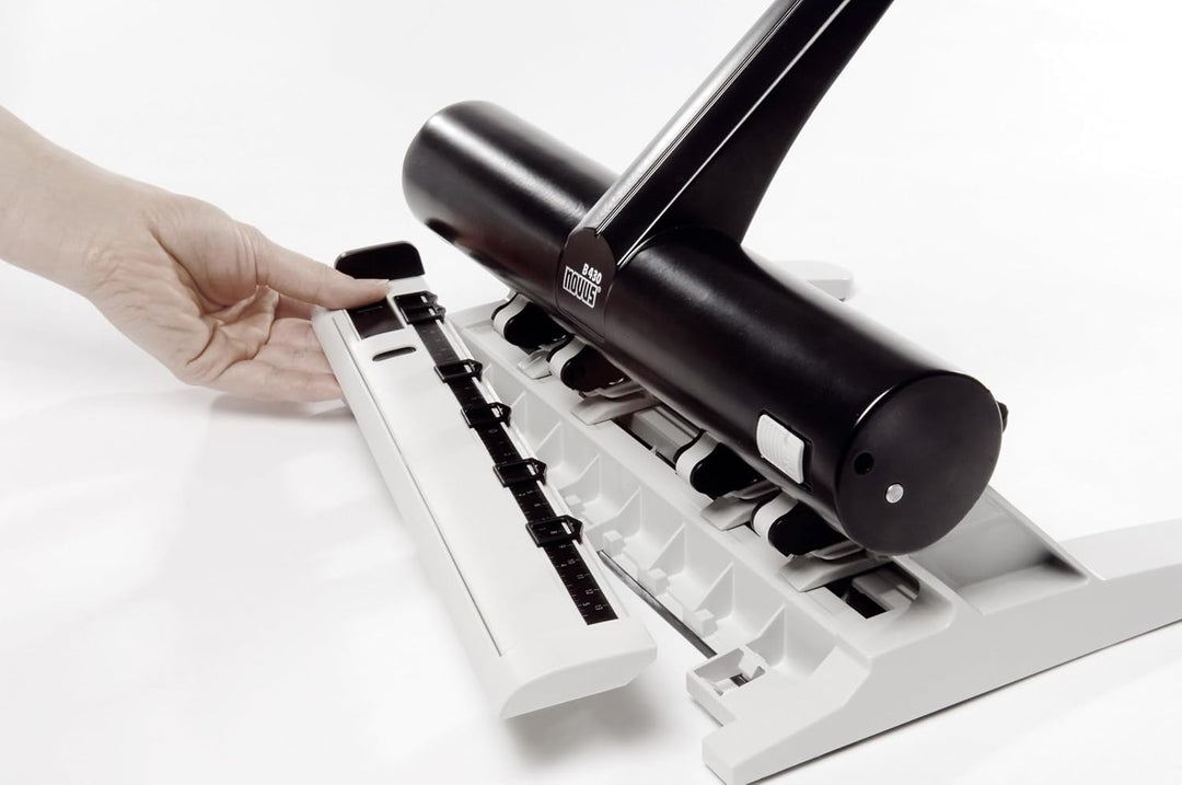 - Zur komfortablen Einstellung der Lochformate kann die patentierte Justiereinheit abgenommen werden. So können Sie den Lochabstand exakt einstellen, ohne diesen mit dem Lineal messen zu müssen