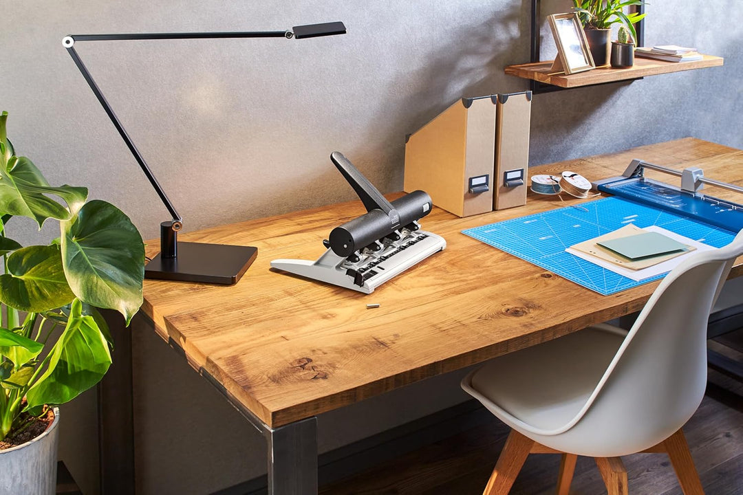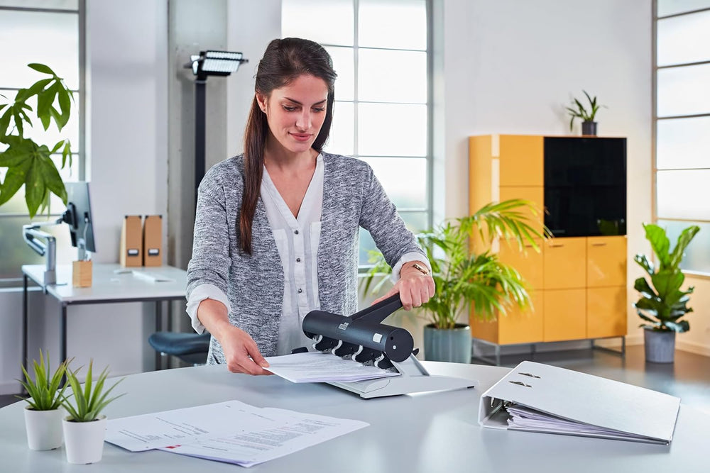 - Der Bürolocher hat rutschfeste Füsse und steht daher fest und sicher. Der Hebel des Lochers kann fixiert werden, wodurch er platzsparend aufbewahrt werden kann