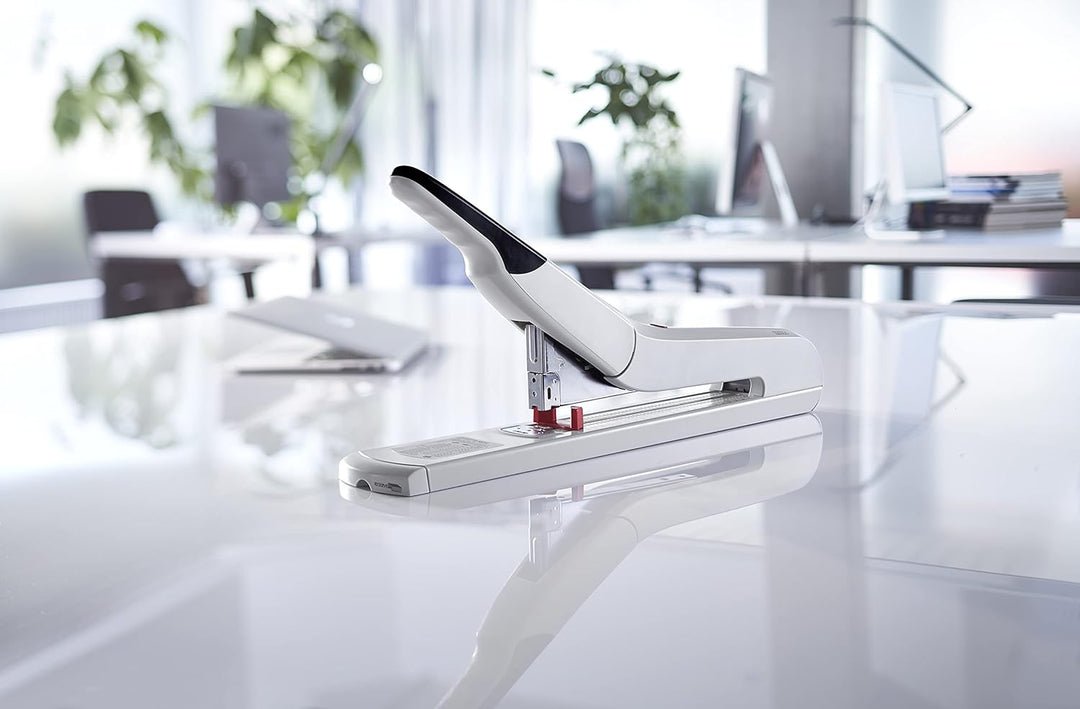• Professioneller Blockhefter mit extra langer Einlegetiefe und einer Heftleistung von 20 bis 170 Blatt Papier (80 g/qm). Ausgestattet mit einem Antiblockiersystem (ABS) für störungsfreies Heften ohne Klammerstau