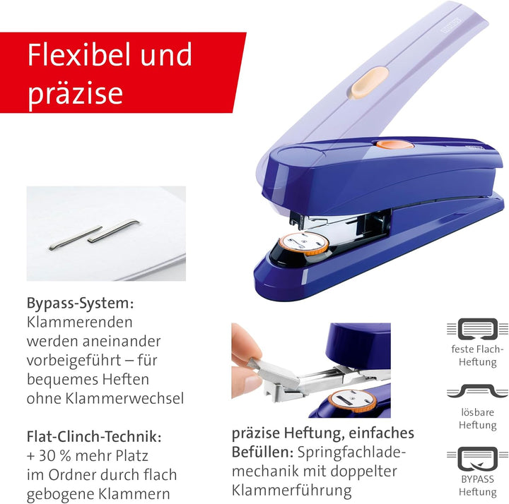 - Das Bypass-System, das die Klammerenden geschickt aneinander vorbeiführt, sorgt für bequemes Heften von 2 bis 50 Blatt ohne Klammerwechsel mit der Heftklammer 24/8 Super