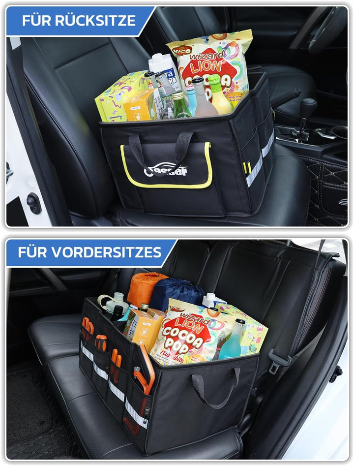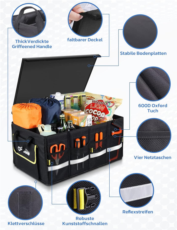 • Reflexstreifen: Die Neon-Reflektoren von Kofferraum Box bieten nachts zusätzliche Sichtbarkeit und Sicherheit beim Be- und Entladen Kofferraumtasche