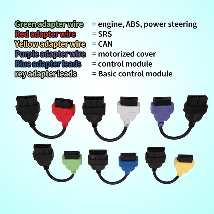 - Grün Rot Gelb Adapter: Grüne ABS Servolenkungsadapterkabel könnten auf ABS und Servolenkungssysteme zugreifen, rote SRS Adapterkabel auf SRS Systeme, gelbe CAN Adapterkabel auf Low Speed CAN Systeme.